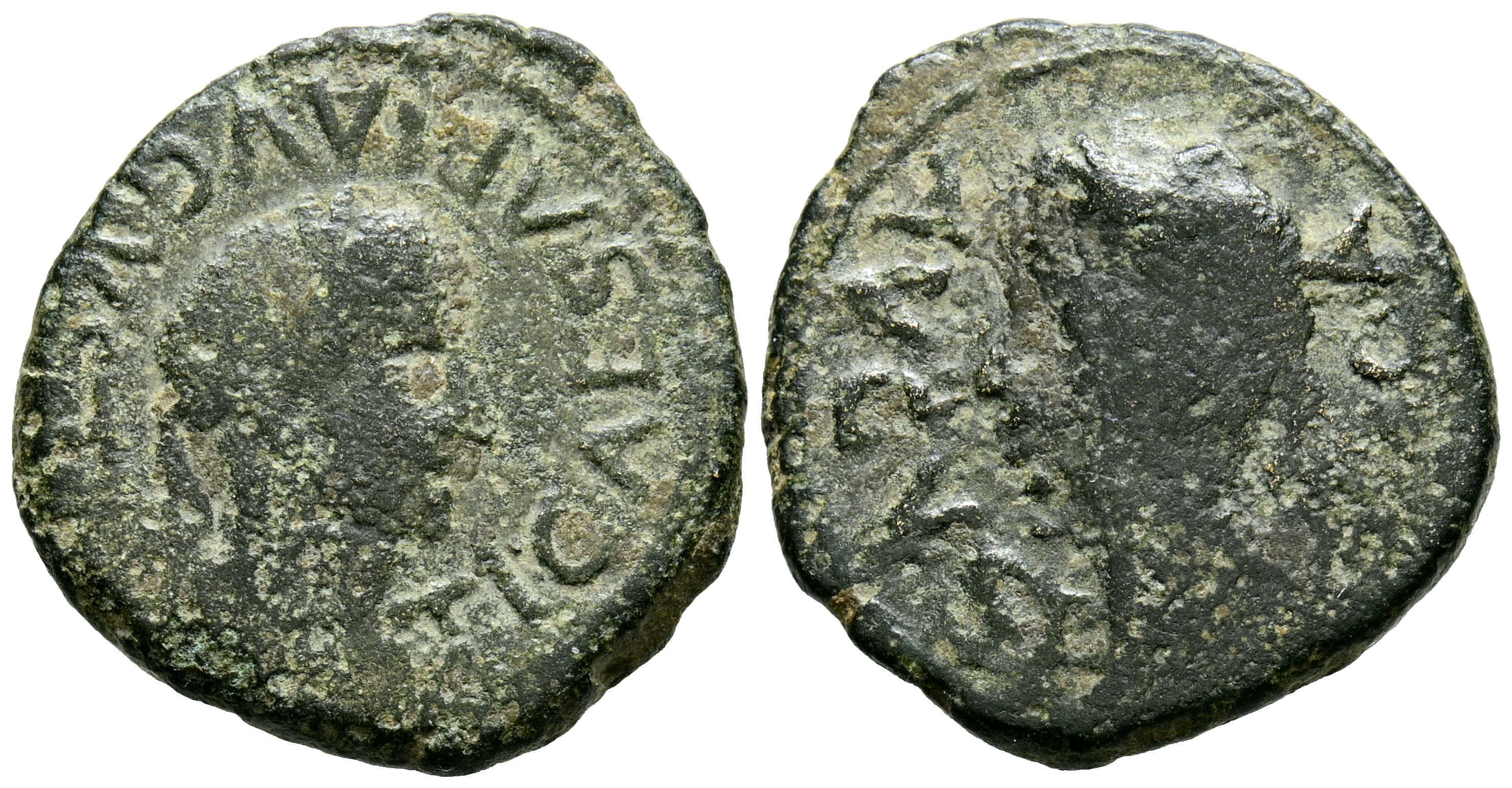 CAESARAUGUSTA (Zaragoza). Semis. (Ae. 4,49g/21mm). 14-36 d.C. (FAB-372). Anv: Cabeza laureada de Tiberio a derecha, alrededor leyenda: TI CAESAR AVG. Rev: Cabeza laureada de Augusto a izquierda, delante leyenda: AVGVSTVS, detrás: CCA. MBC/BC+.