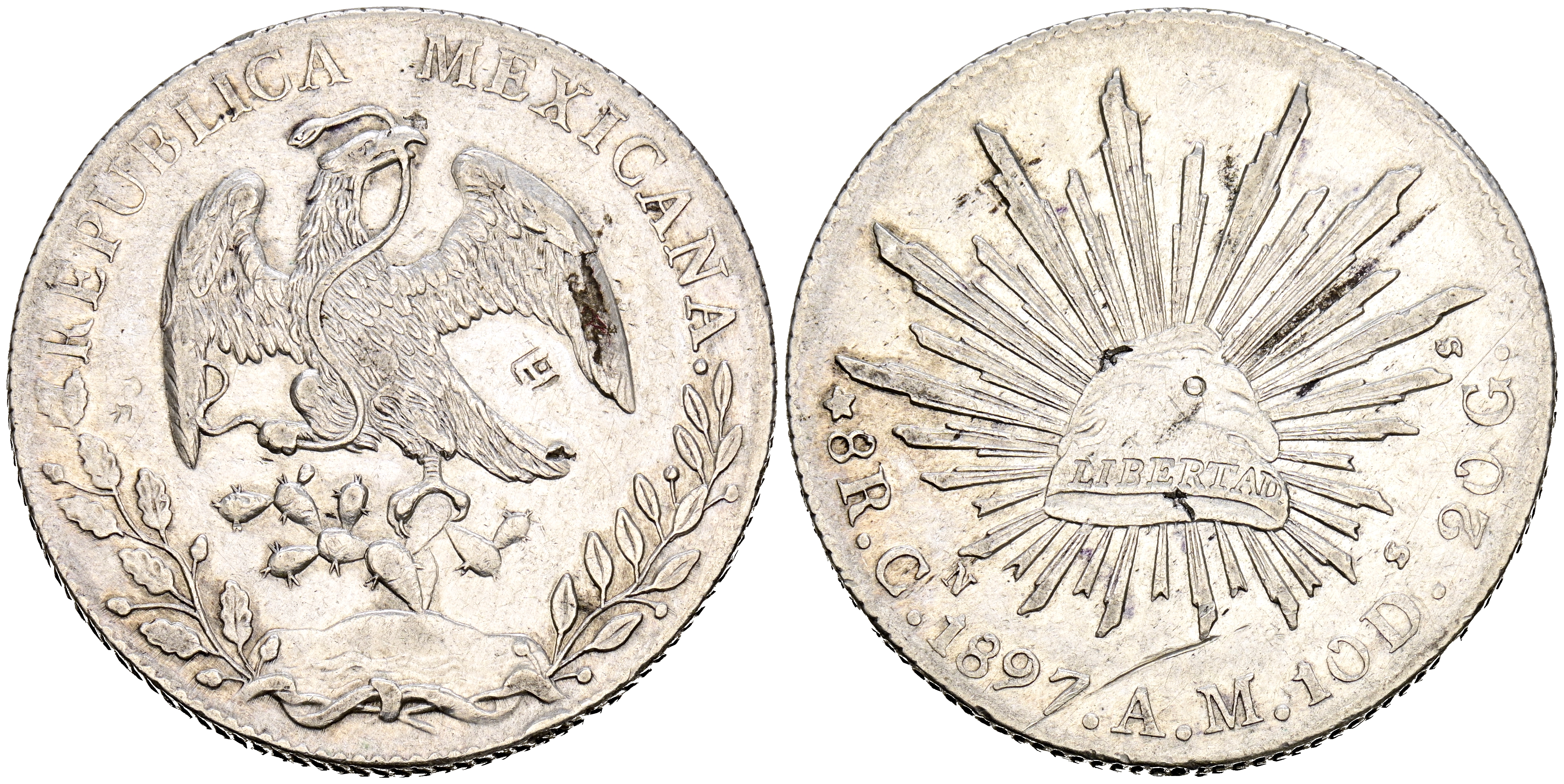 MÉXICO. 8 Reales. (Ar. 26,94g/39mm). 1897. Culiacan AM. (Km#377.3). MBC+. Pequeños resellos orientales.