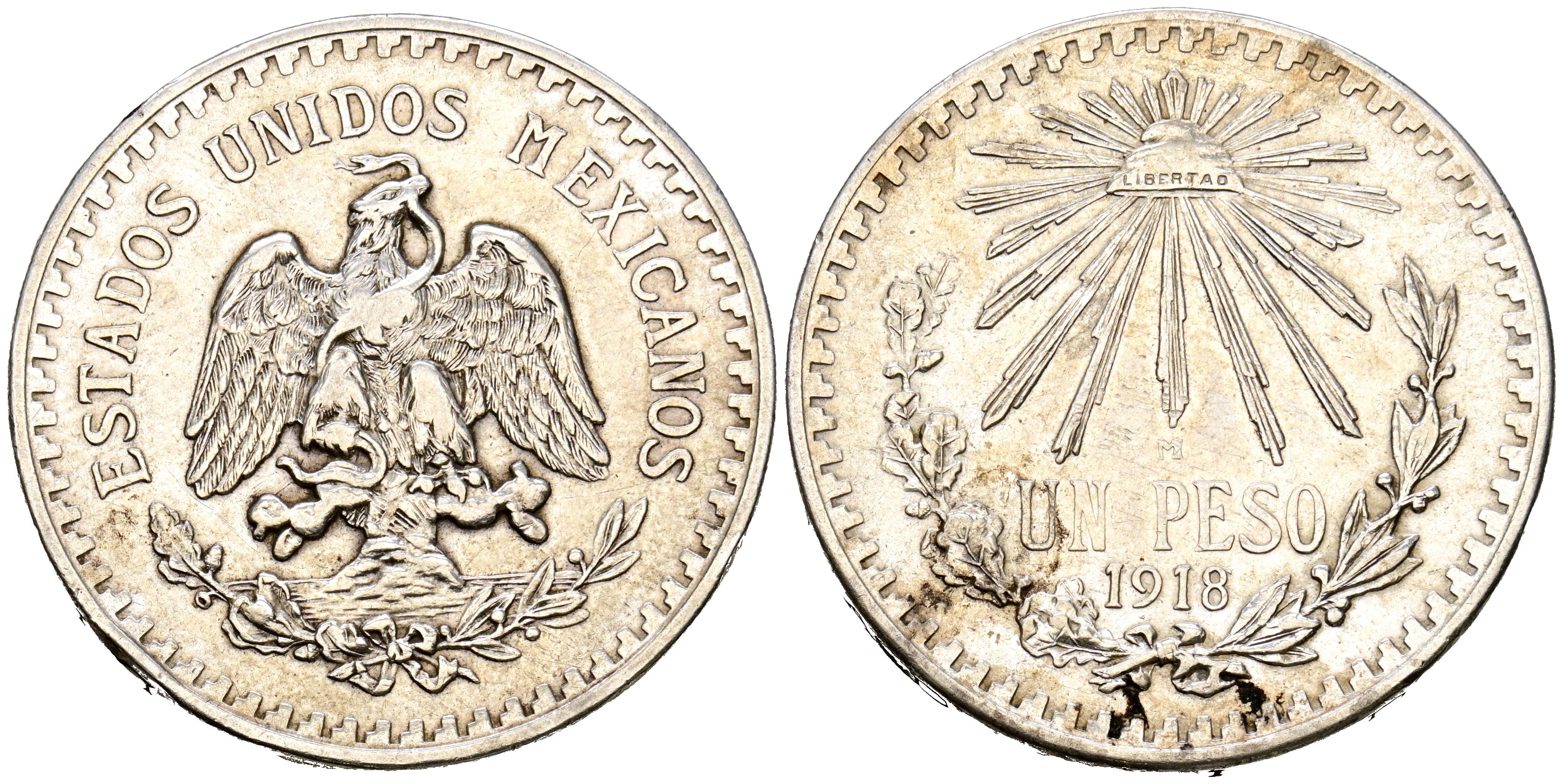 MÉXICO. 1 Peso. (Ar. 18,12g/34mm). 1918. México. (Km#454). MBC+.