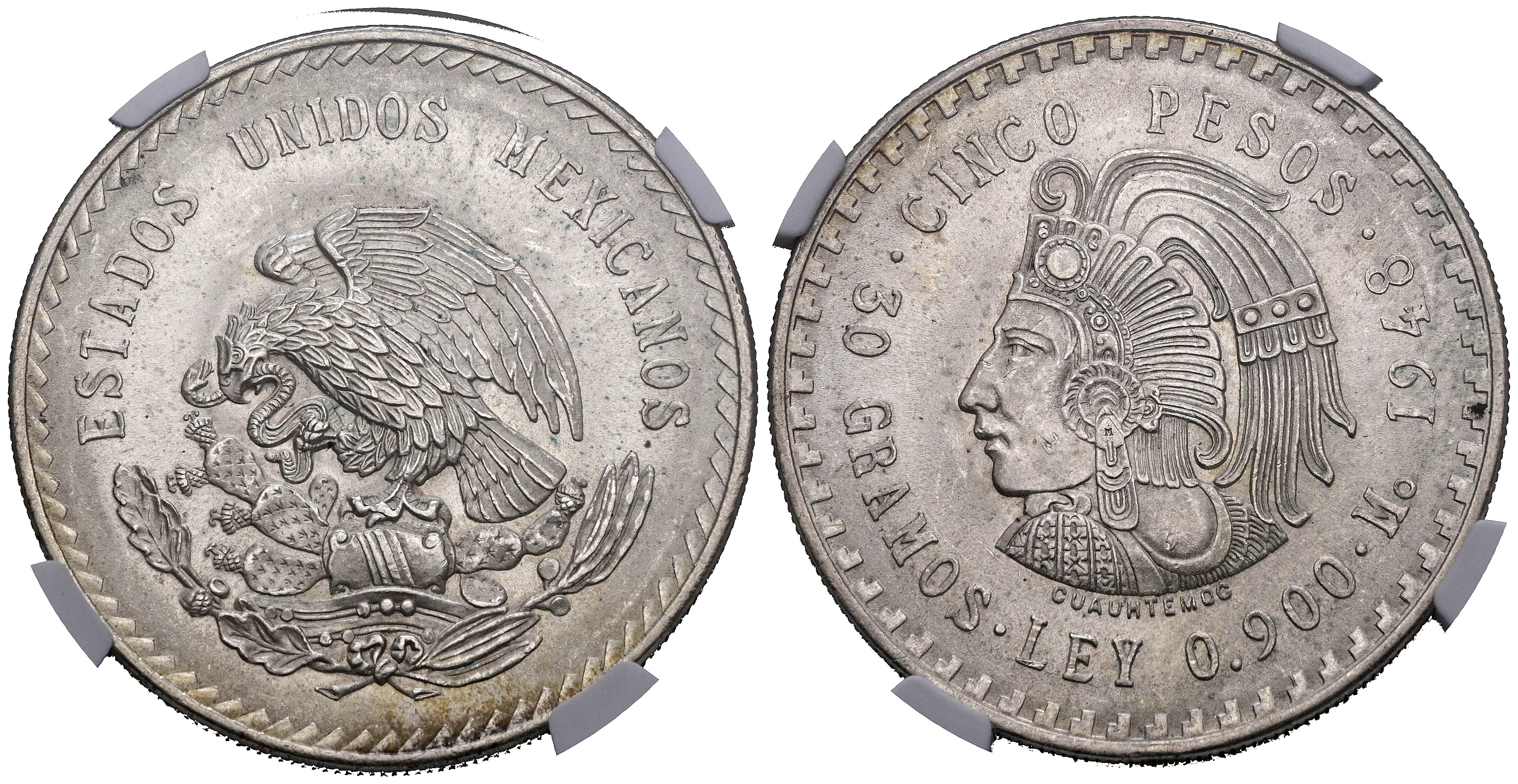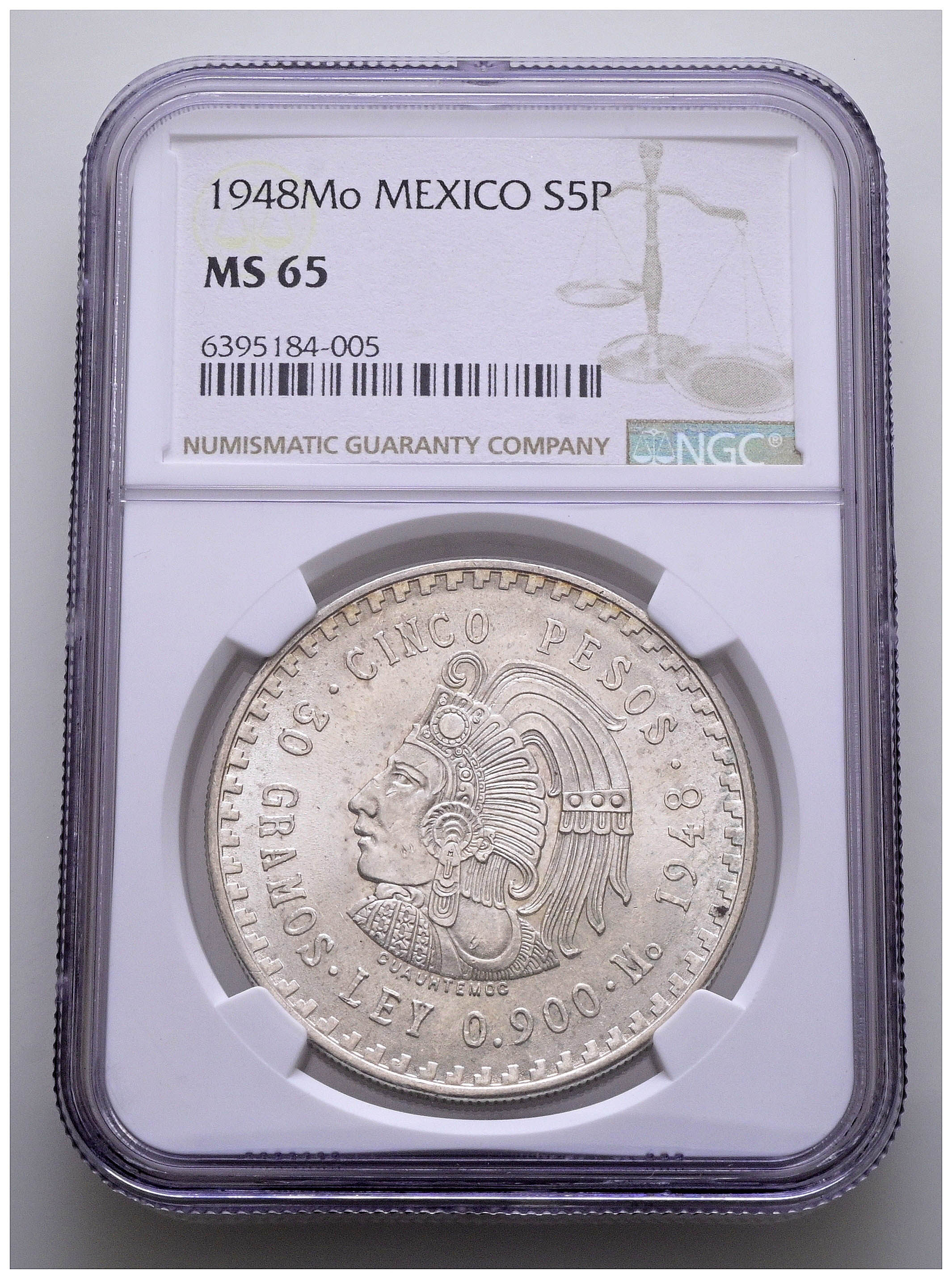 MÉXICO. 5 Pesos. (Ar. 30,00g/40mm)*. 1948. (Km#465). Encapsulado por NGC MS 65. *Peso y medida teóricos.