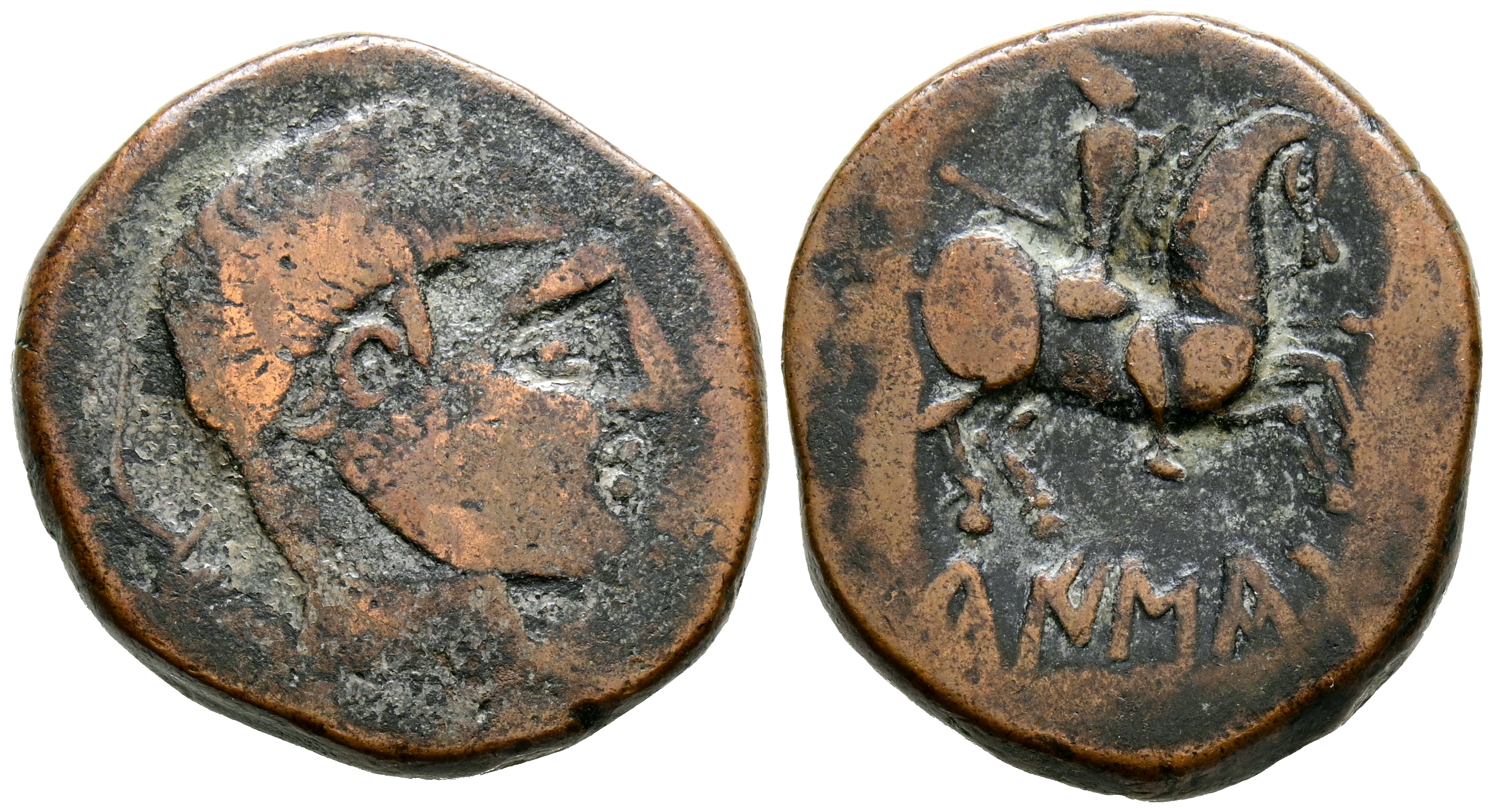CAISCATA (Cascante, Navarra). As. (Ae. 12,18g/25mm). 120-20 a.C. (FAB-687). Anv: Cabeza masculina barbada a derecha, detrás delfín, delante letra ibérica: Ca. Rev: Jinete con lanza a derecha, debajo leyenda ibérica: CaISCATa. BC+. Limpiada.