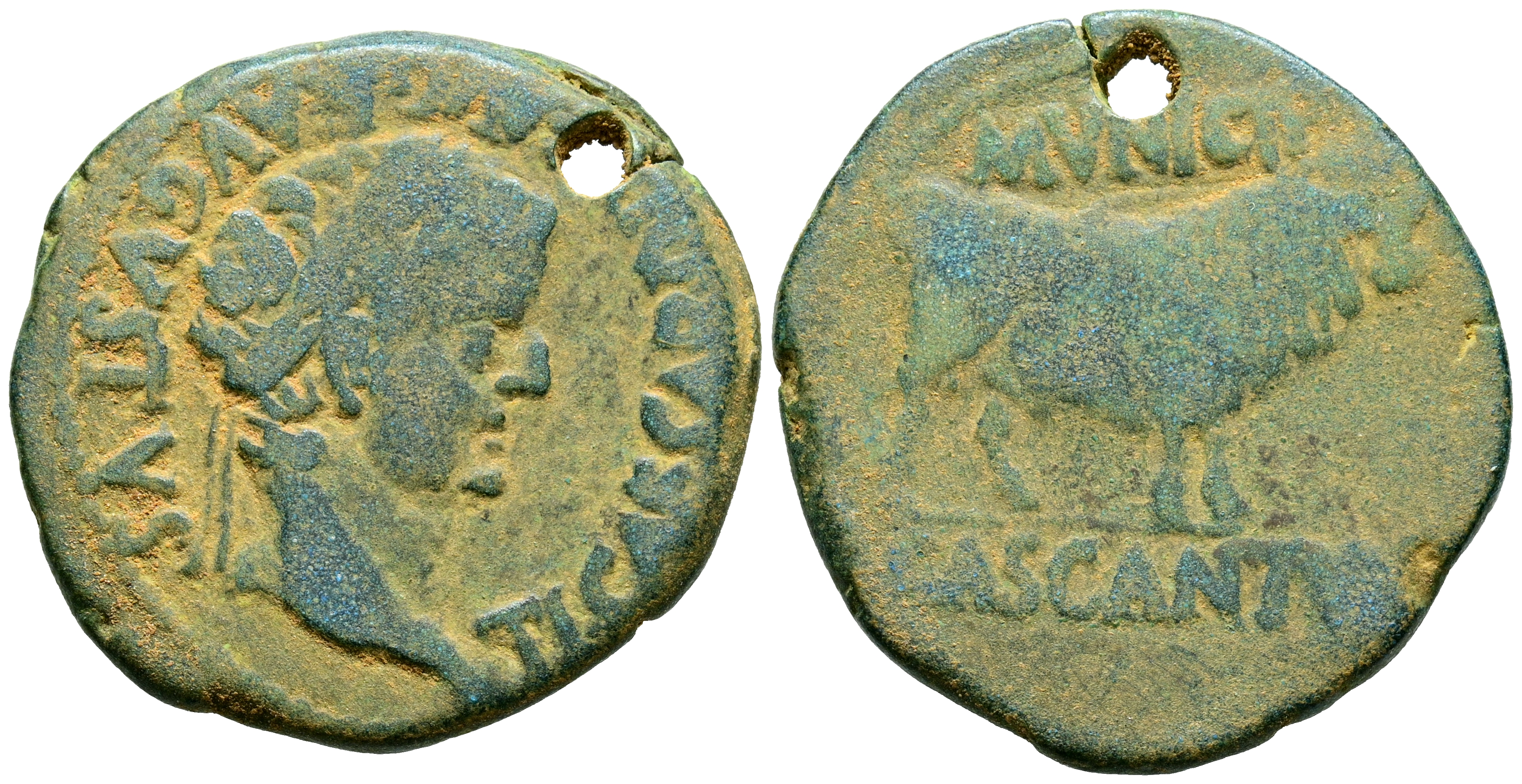 CASCANTUM (Cascante, Navarra). As. (Ae. 9,63g/28mm). 14-36 d.C. (FAB-691). Anv: Cabeza laureada de Tiberio a derecha, alrededor leyenda: TI CAESAR DIVI AVG F AVGVSTVS. Rev: Toro a derecha, encima leyenda: MVNICIP, debajo: CASCANTVM. MBC-. Perforación.