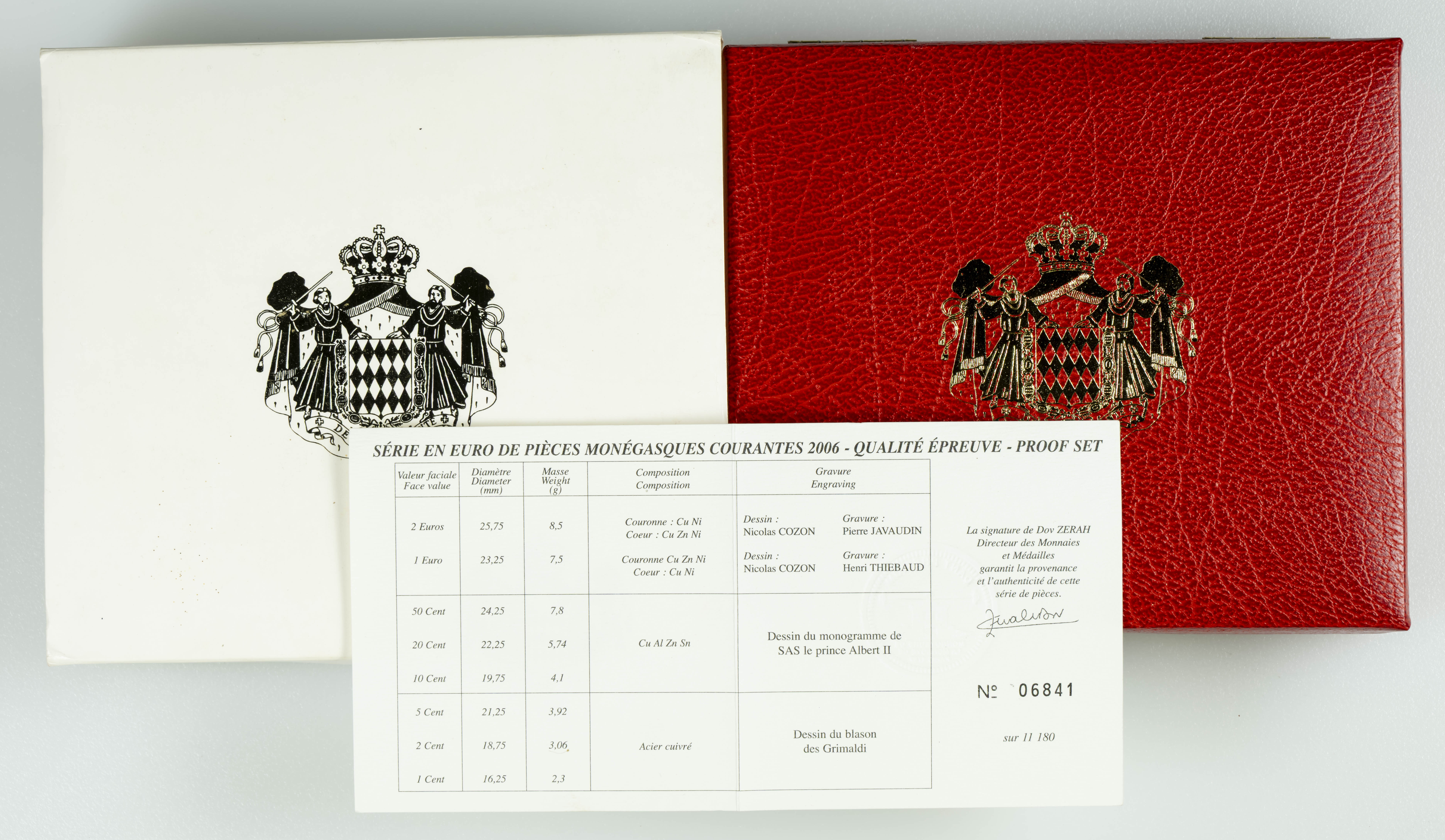 MÓNACO. Set completo de la emisión del Euro de 2006. Belle Épreuve. 8 Valores comprendidos entre 1 Céntimo y 2 Euros Monnaie de París. Incluye estuche original y certificado de autenticidad. PROOF. Escaso.
