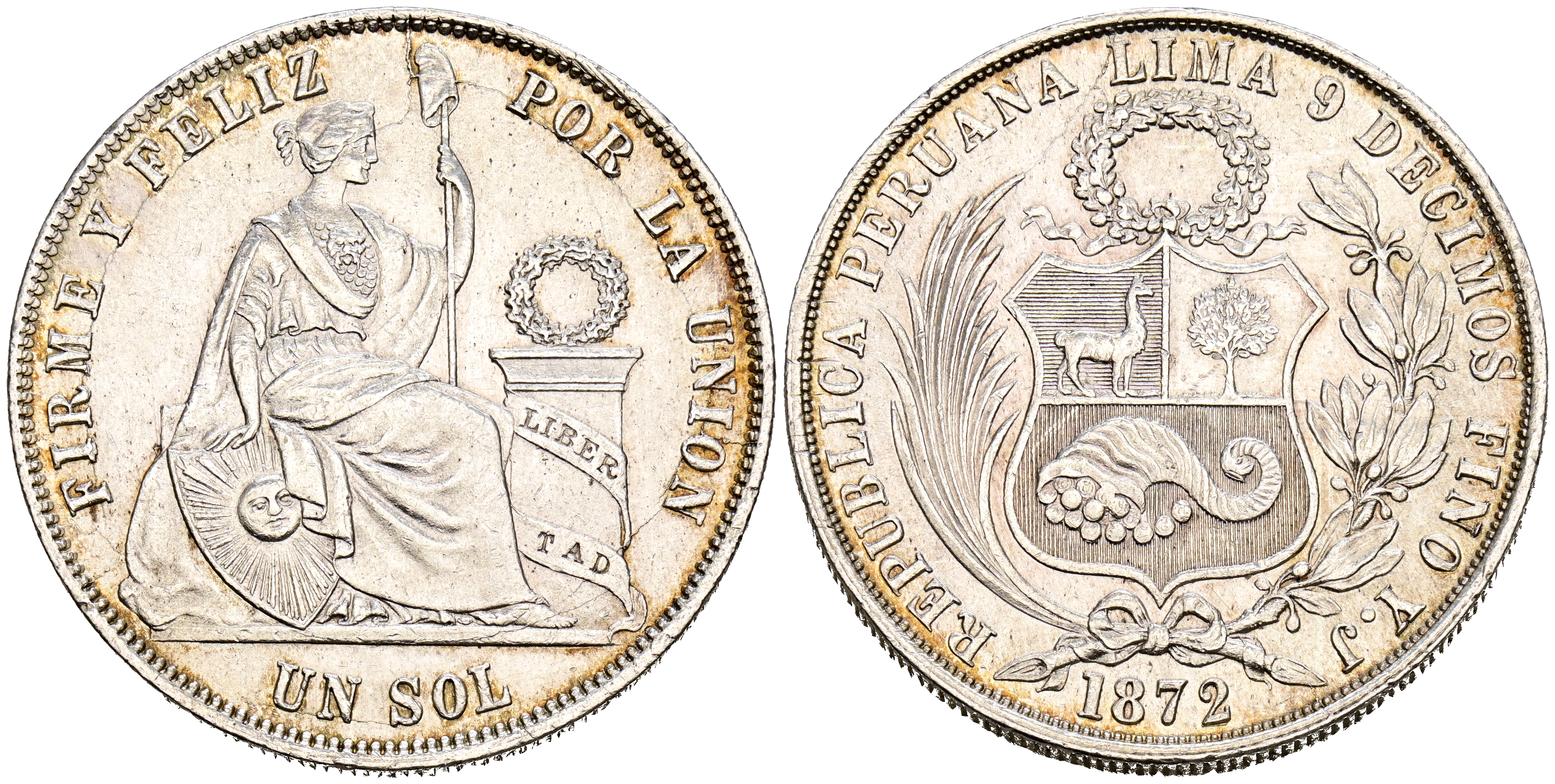 PERÚ. 1 Sol. (Ar. 24,96g/38mm). 1872. Lima YJ. (Km#196). EBC. Brillo original.