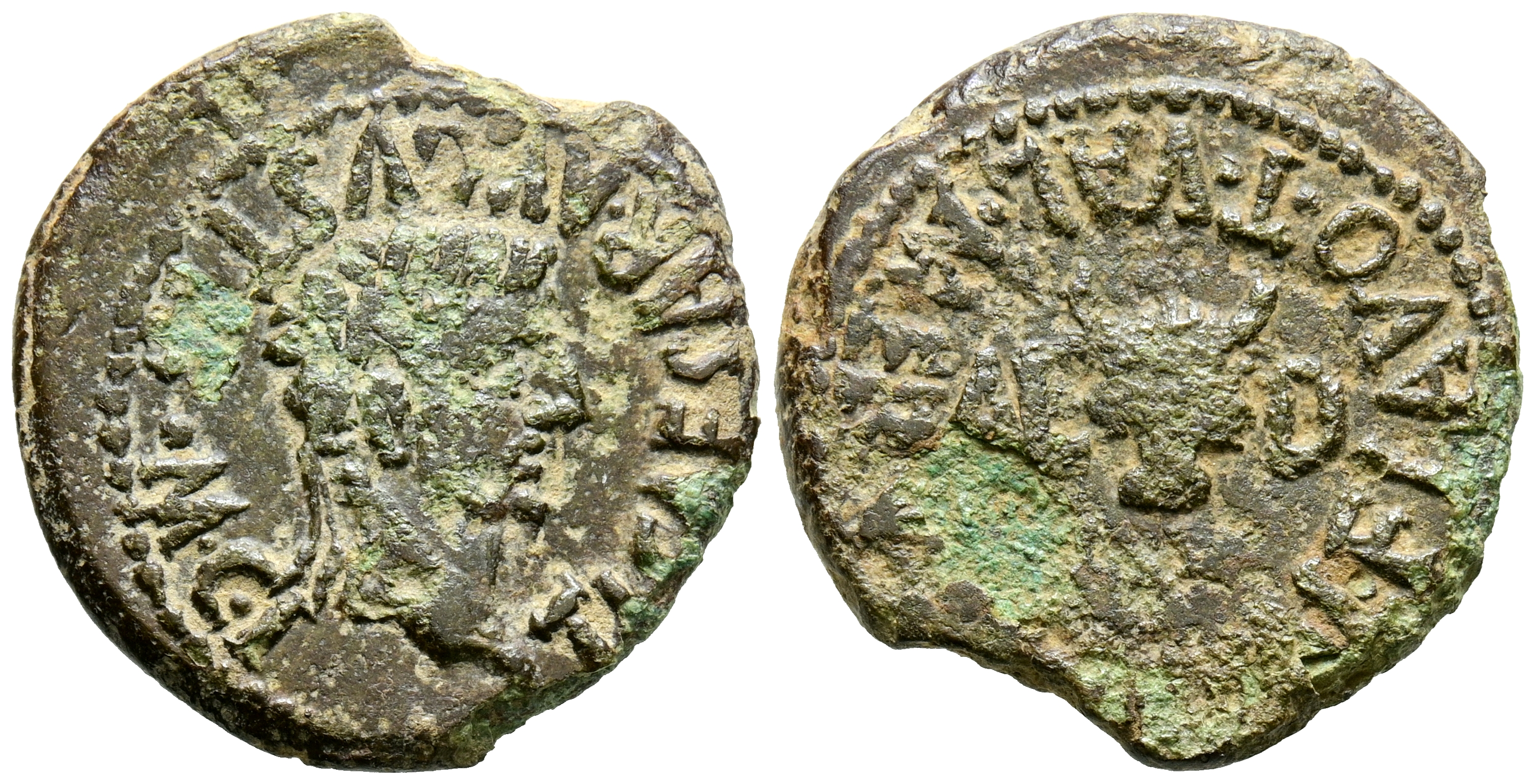 CALAGURRIS (Calahorra, La Rioja). Semis. (Ae. 4,04g/21mm). 14-36 d.C. (FAB-431). Anv: Cabeza laureada de Tiberio a la derecha, alrededor leyenda: TI CAESAR AVGVST FMC I. Rev: Cabeza de toro entre: AE-D, alrededor leyenda: L VAL FLAVO T VAL MERVLA. MBC/MBC-. Oxidaciones.