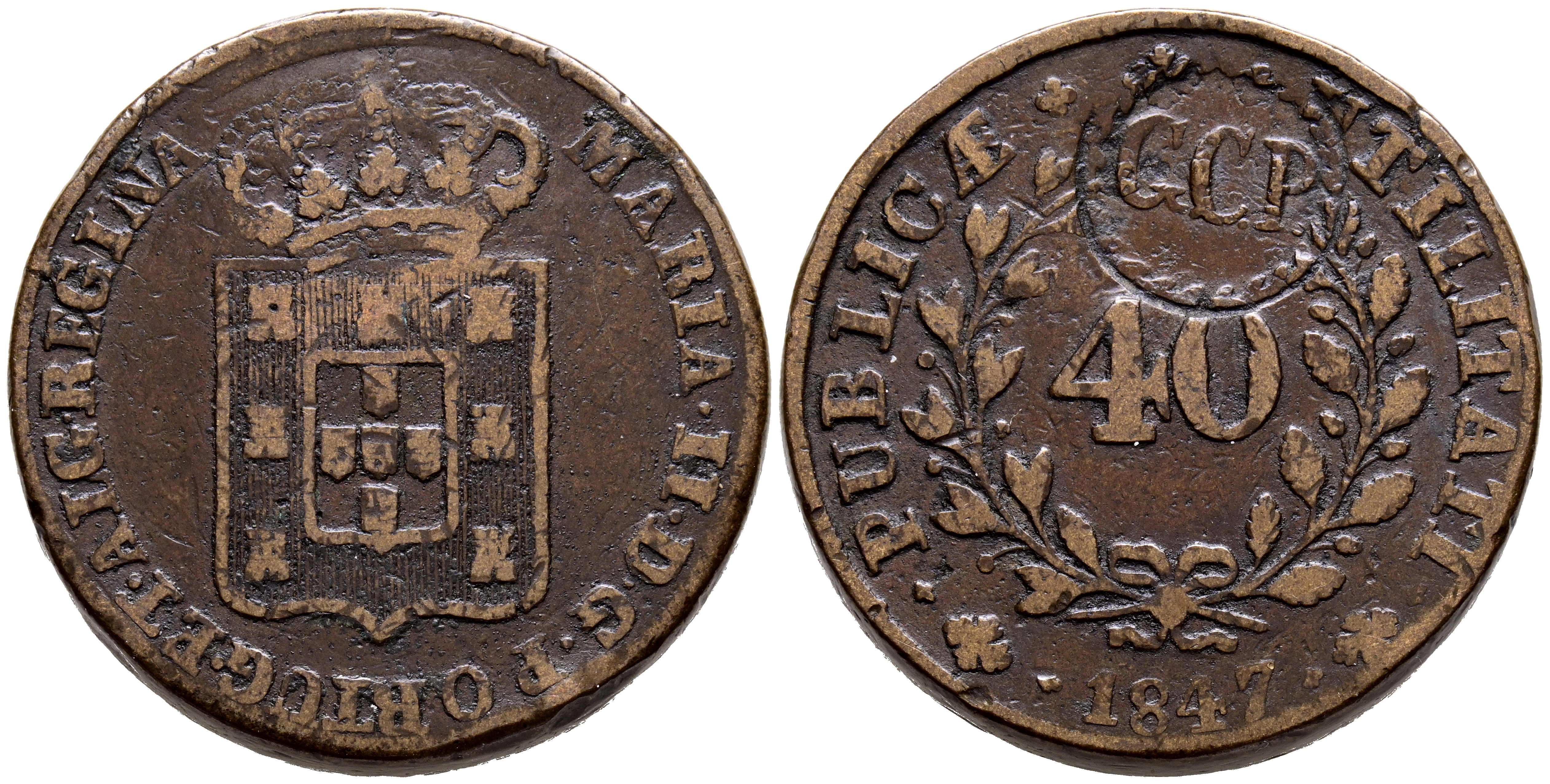 PORTUGAL, María II (1834-1853). 40 Reis o Pataco. (Ae. 34,16g/35mm). 1847. (Gomes 20.10). MBC-. Resello GCP en reverso.