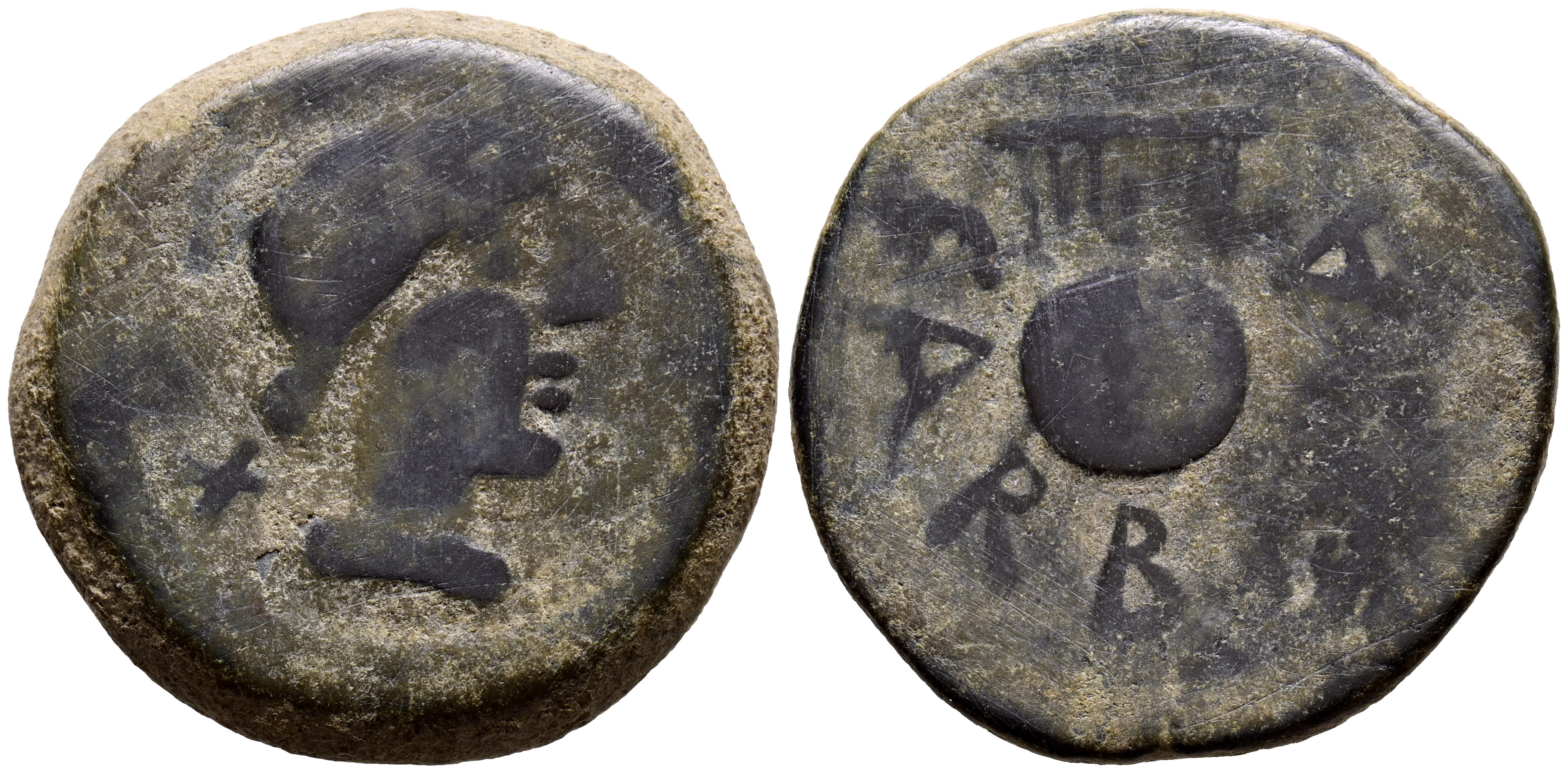 CARBULA (Almodóvar del Río, Córdoba). As. (Ae. 23,14g/32mm). 80 a.C. (FAB-440). Anv: Cabeza de Apolo a derecha, detrás letra ibérica: Ta, delante ¿serpiente?. Rev: Lira, debajo leyenda: CARBVLA. MBC-.