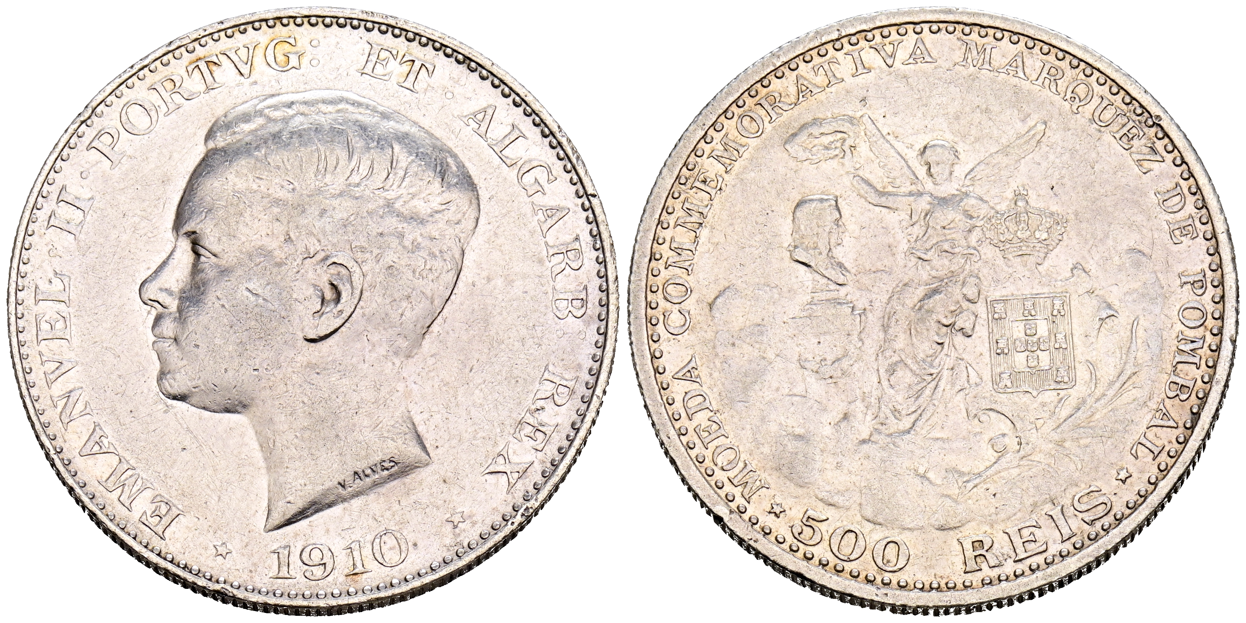 PORTUGAL, Manuel II. 500 Reis. (Ar. 12,46g/31mm). 1910. Marqués de Pombal. (Km#557). MBC+. Marquitas.