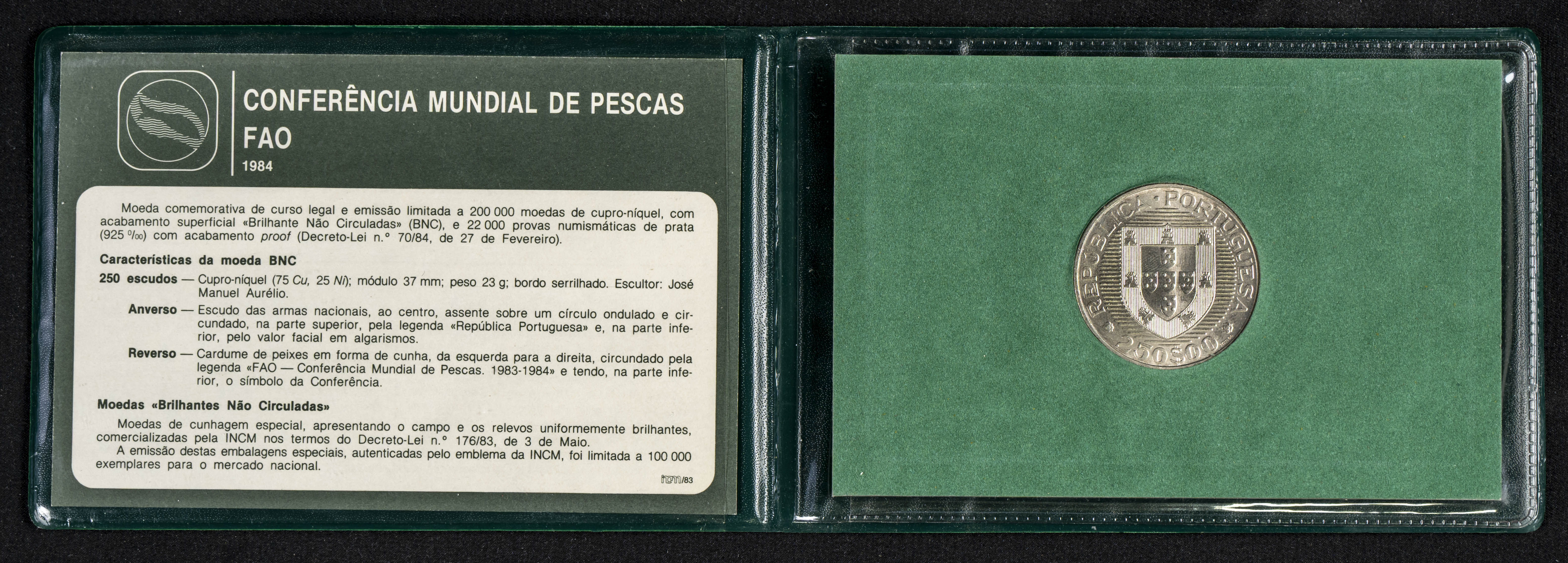 PORTUGAL. 250 Escudos. (CuNi. 23,00g/37mm). 1984. FAO. Conferencia Mundial de Pesca. (Km#626). SC. Incluye estuche original y certificado de autenticidad.