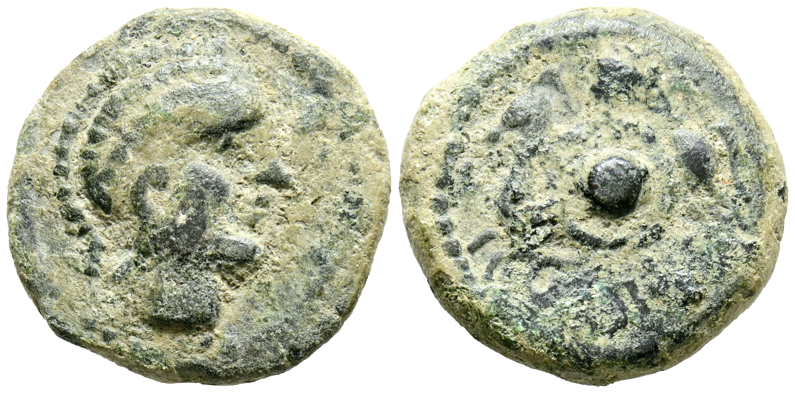 CARISA (cerca de Bornos, Cádiz). Semifinales. (Ae. 5,53g/19mm). 50 a.C. (FAB-448). Anv: Cabeza masculina diademada a derecha. Rev: Jinete con lanza y escudo a derecha, debajo leyenda invertida: CARIS. MBC.