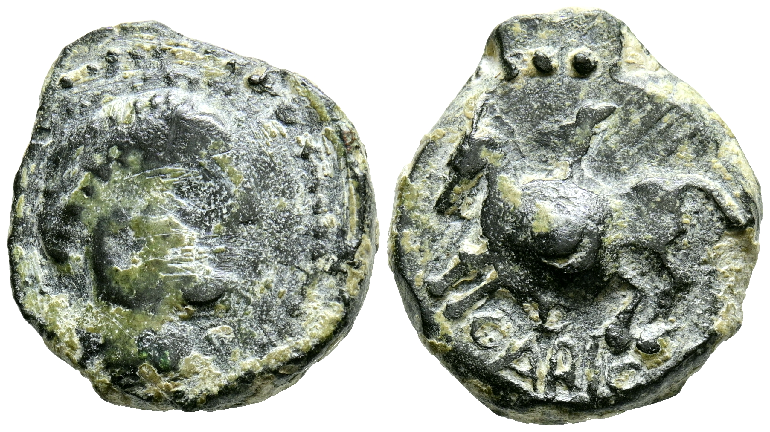 CARISA (cerca de Bornos, Cádiz). Semis. (Ae. 5,73g/20mm). 50 a.C. (FAB-450). Anv: Cabeza masculina con casco a derecha. Rev: Jinete con lanza y escudo a izquierda, debajo leyenda invertida: CARIS. MBC-.