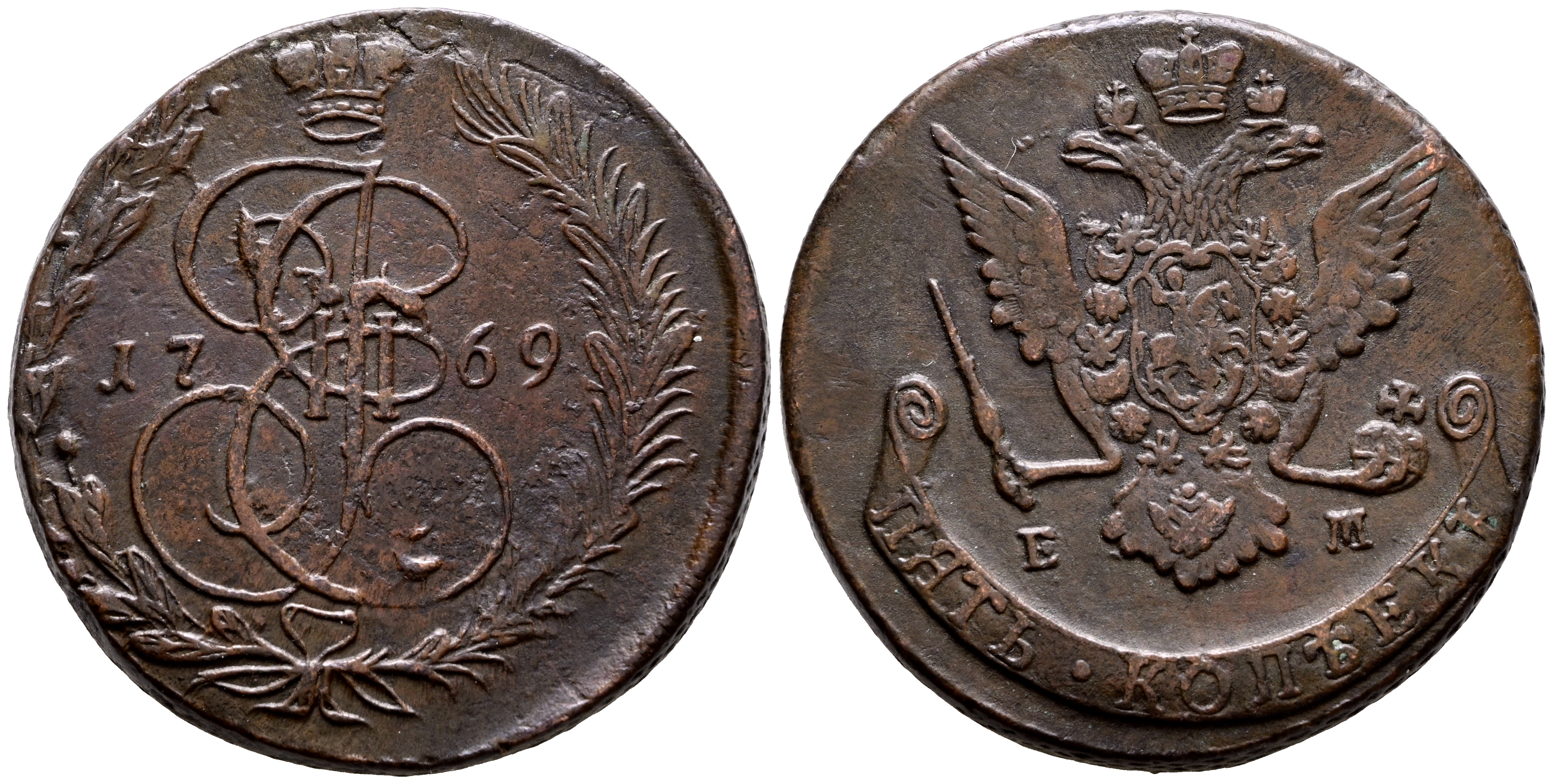 RUSIA, Catalina II (1762-1796). 5 Kopeks. (Ae. 57,60g/43mm). 1769. Ekaterinburgo EM. (Km#C59). MBC+/EBC-.