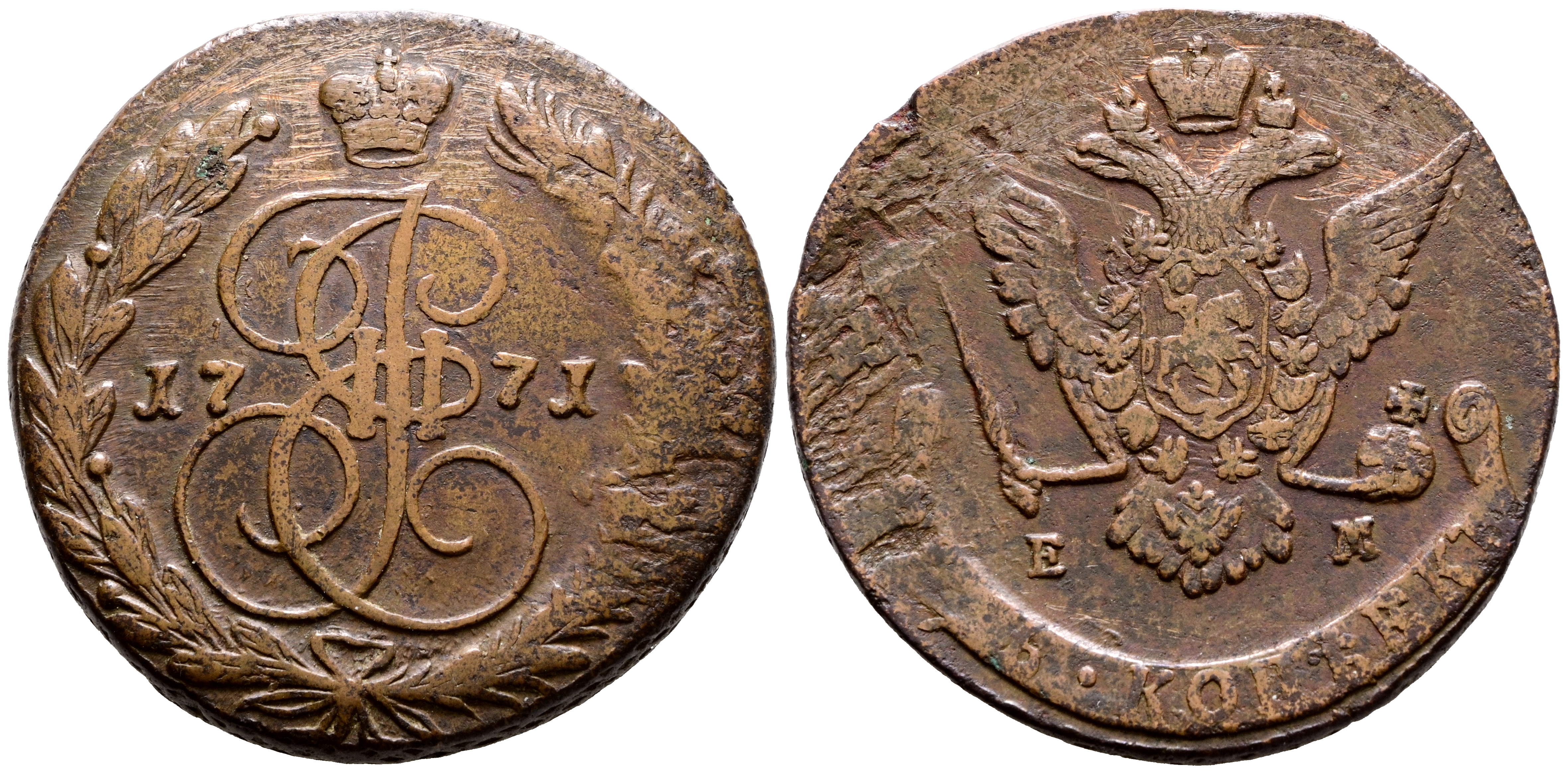 RUSIA, Catalina II (1762-1796). 5 Kopeks. (Ae. 49,40g/42mm). 1771. Ekaterinburgo EM. (KM#C59). MBC-.