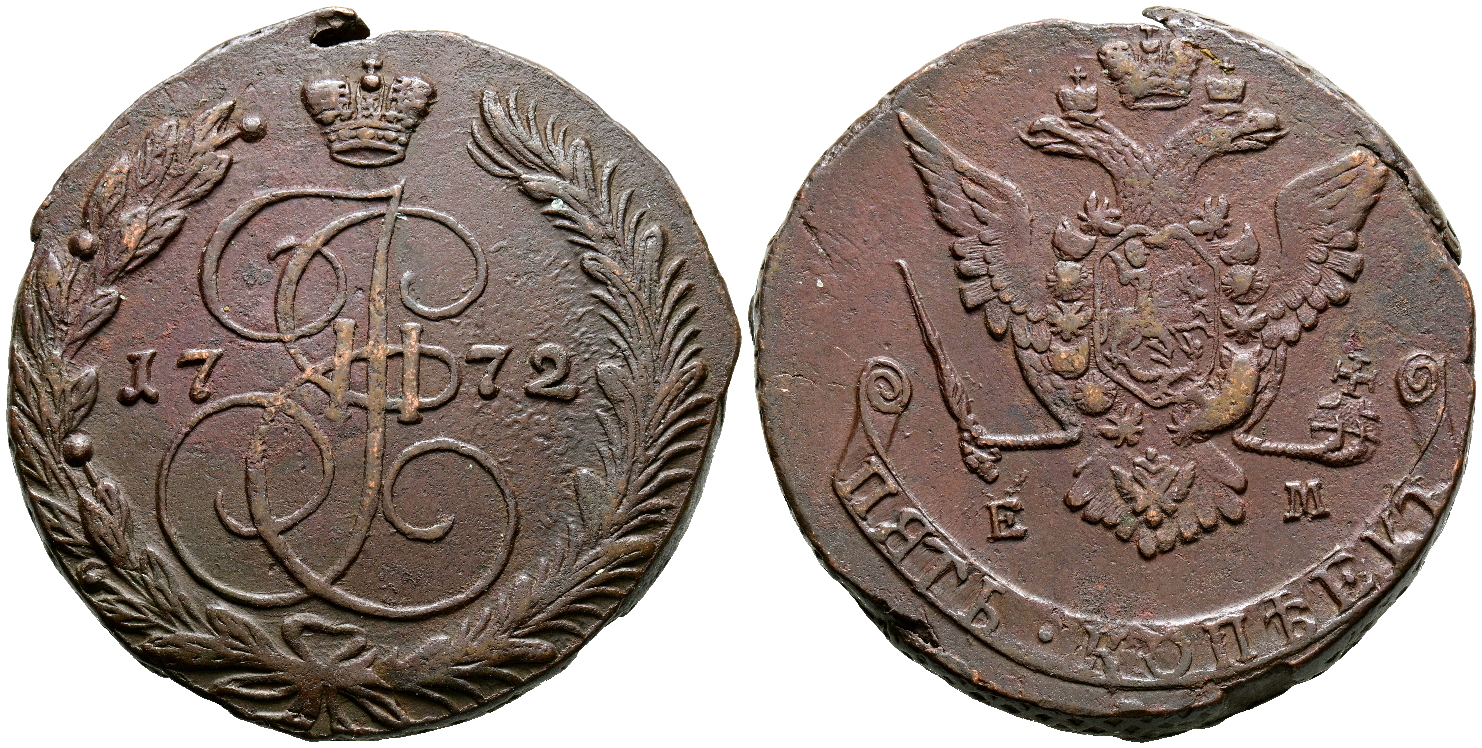 RUSIA, Catalina II (1762-1796). 5 Kopeks. (Ae. 42,79g/41mm). 1772. Ekaterinburgo EM. (Km#C59). MBC+.