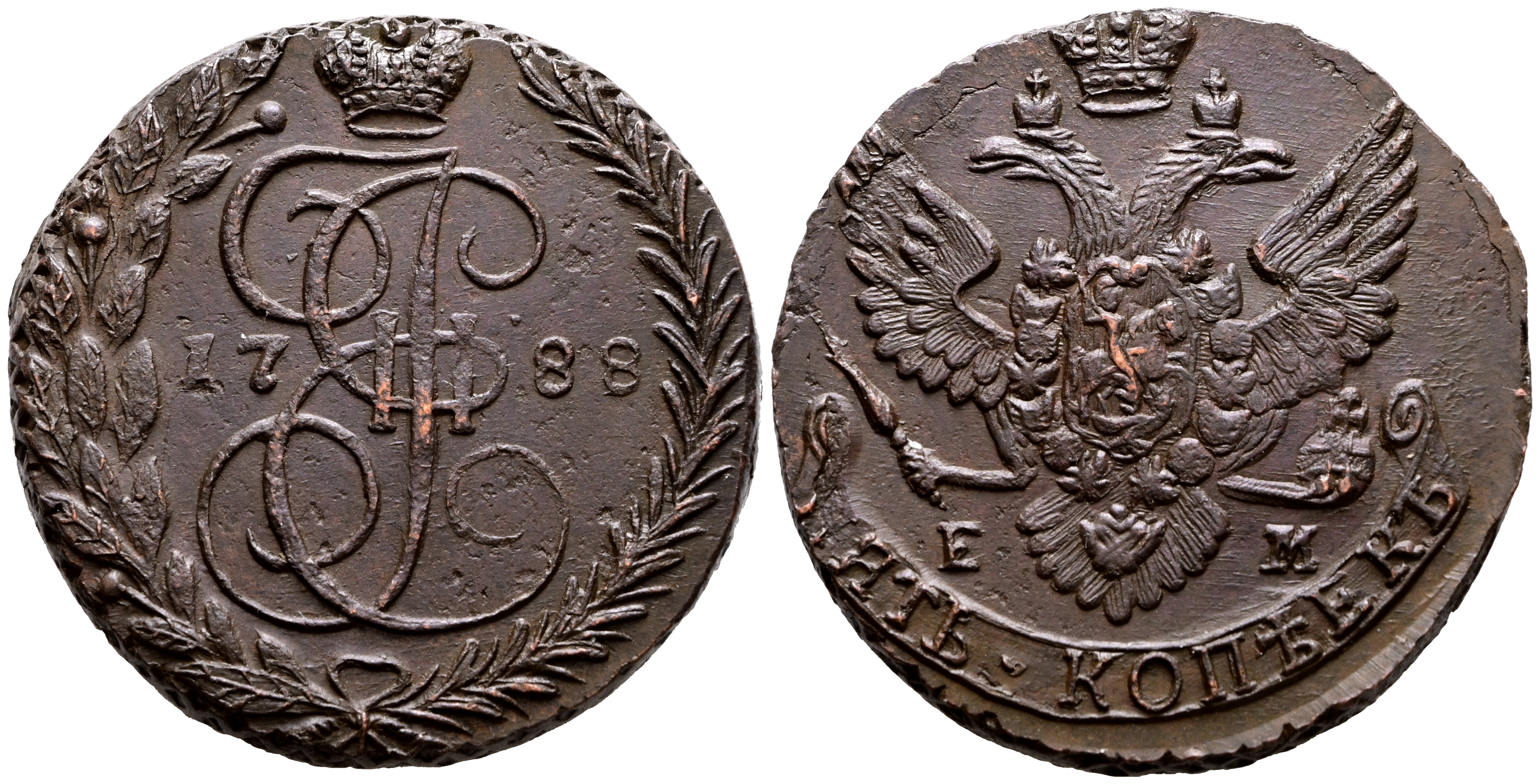 RUSIA, Catalina II (1762-1796). 5 Kopeks. (Ae. 54,65g/43mm). 1788. Ekaterinburgo EM. (Km#C59). EBC. Magnífico ejemplar.