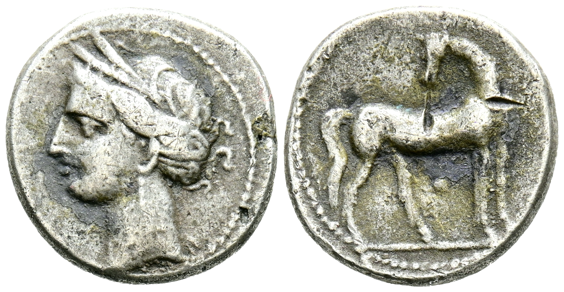 CARTAGONOVA (Cartagena, Murcia). 1/2 Shekel. (Ar. 3,23g/16mm). 220-215 a.C. (FAB-500). Anv: Cabeza diademada de Tanit a izquierda. Rev: Caballo parado a derecha mirando a izquierda, entre las patas puntos. MBC.