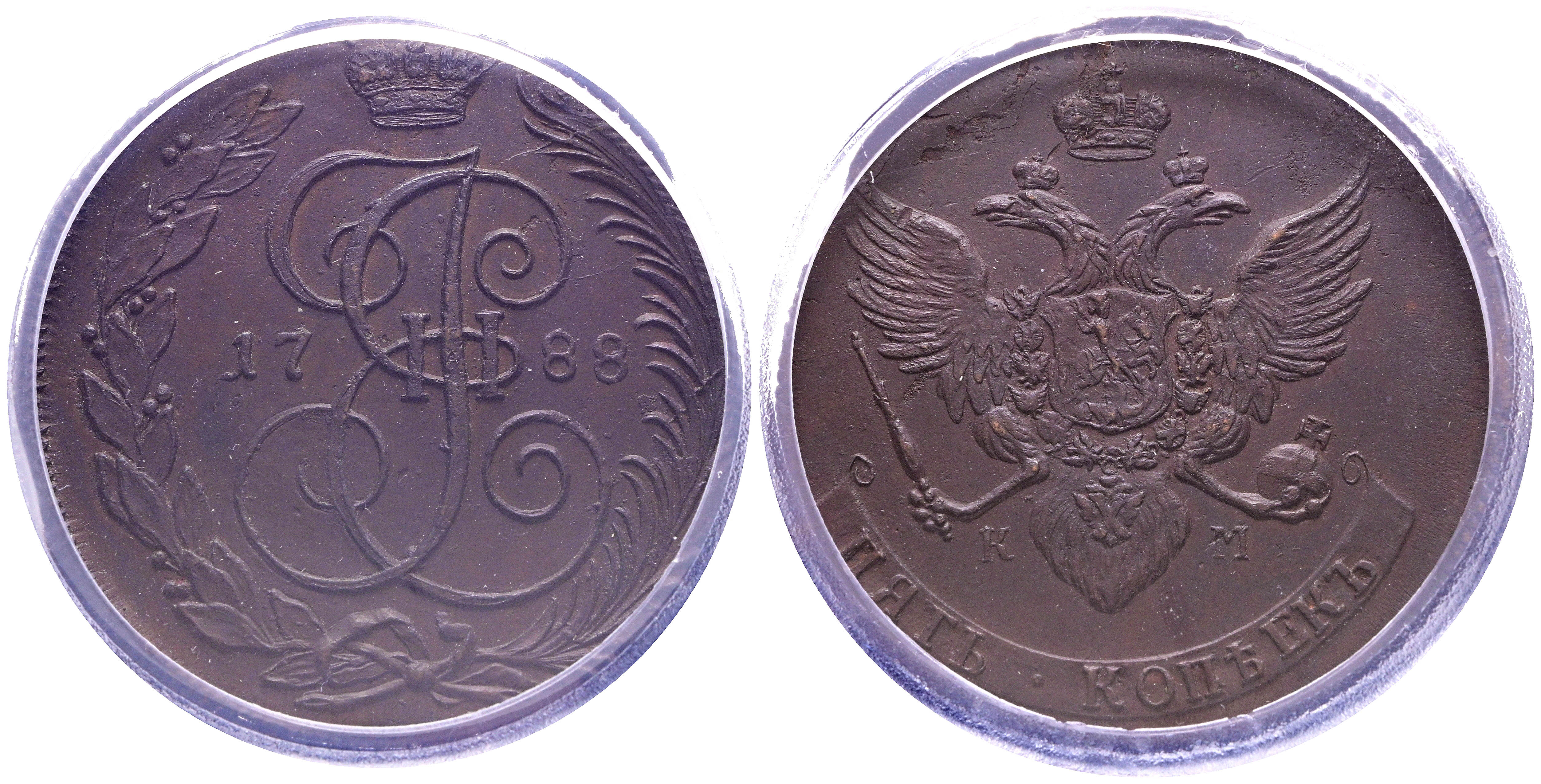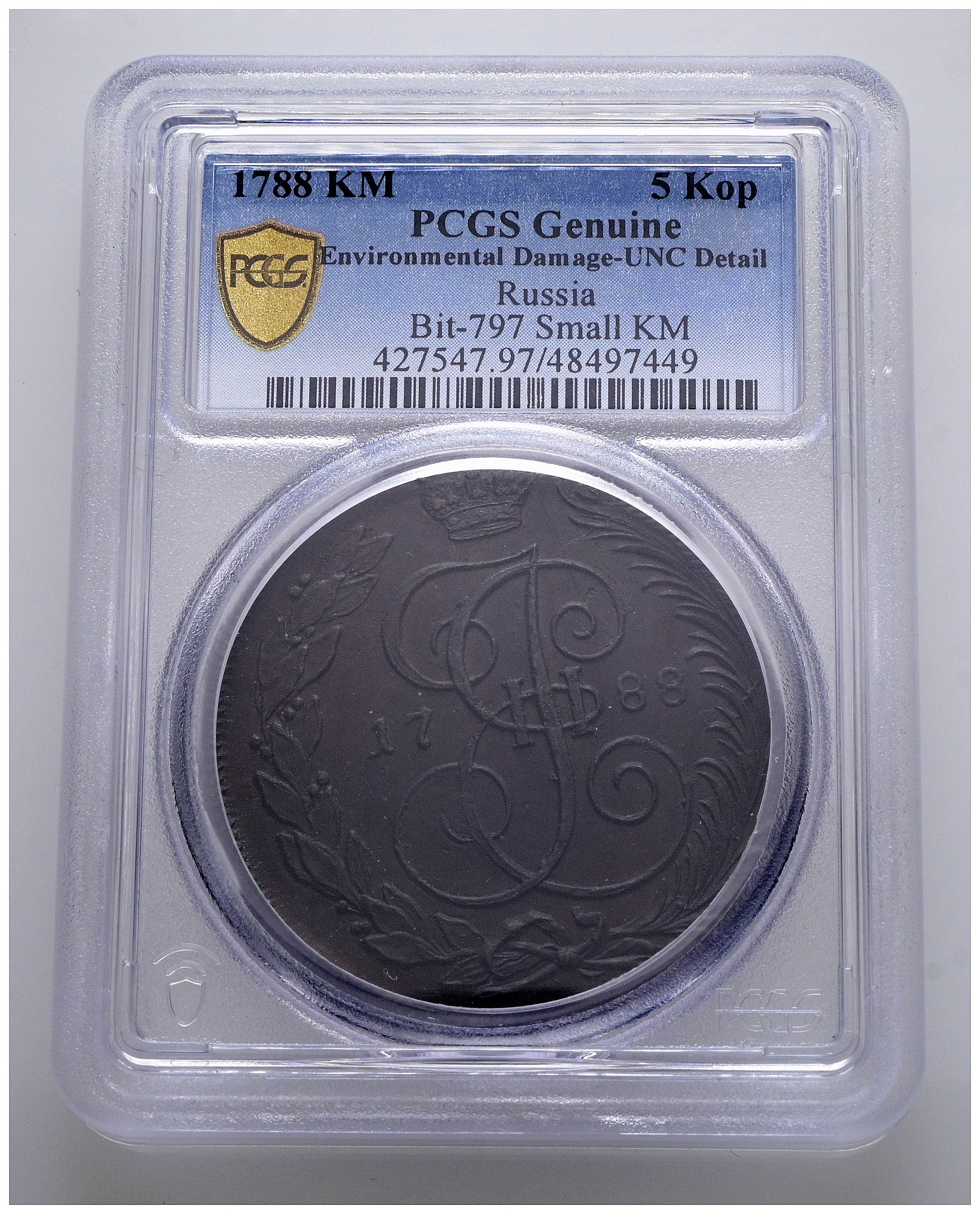 RUSIA, Catalina II (1762-1796). 5 Kopeks. (Ae. 51,19g/42mm)*. 1788. Suzun KM. (Km#C59). Encapsulada por PCGS UNC Details. Environmental Damage. Escasa. *Peso y medidas teóricos.