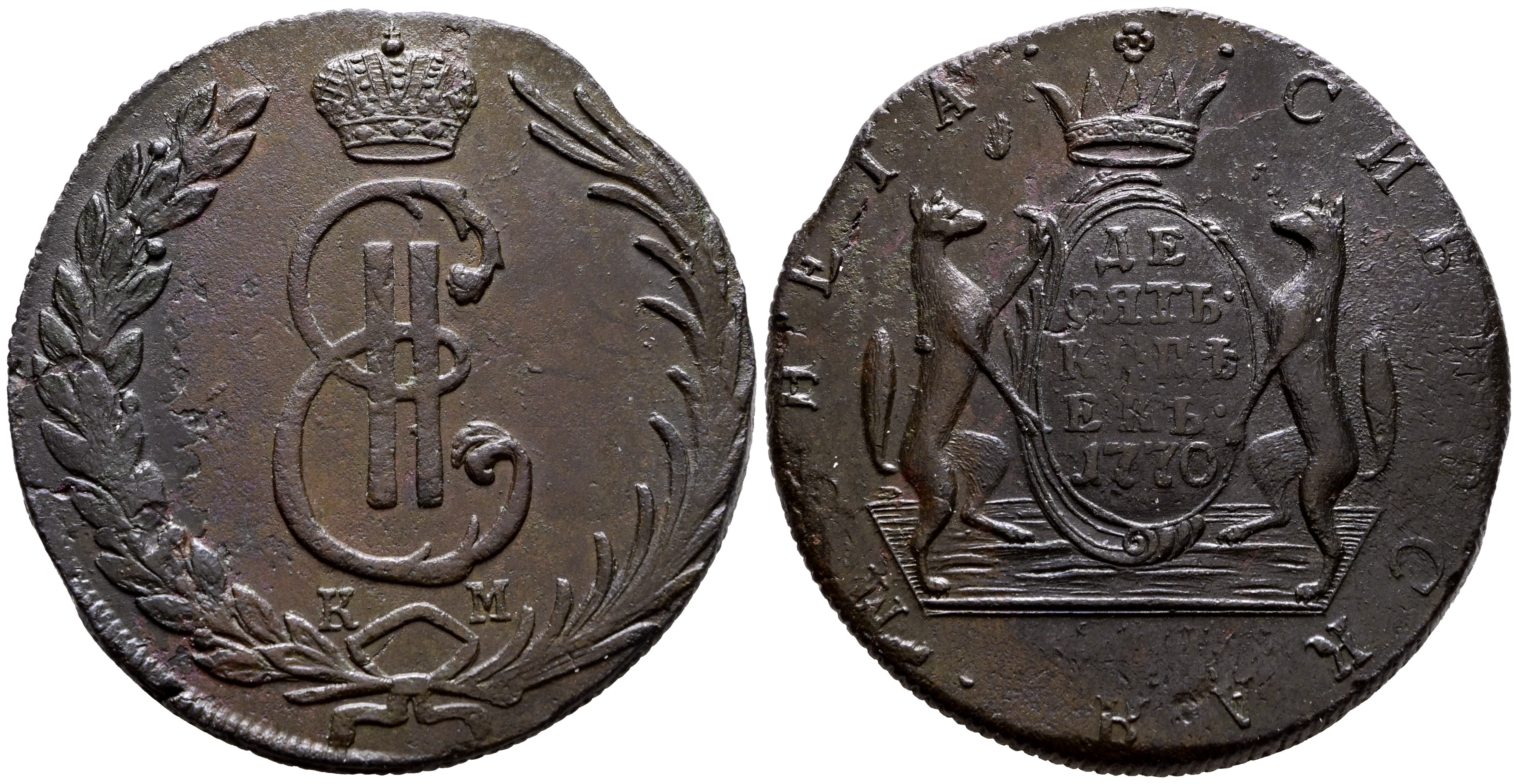 RUSIA, Catalina II (1762-1796). 10 Kopeks. (Ae. 50,57g/46mm). 1770. Suzun KM (Siberia). (Km#C6). MBC+. Escasa.