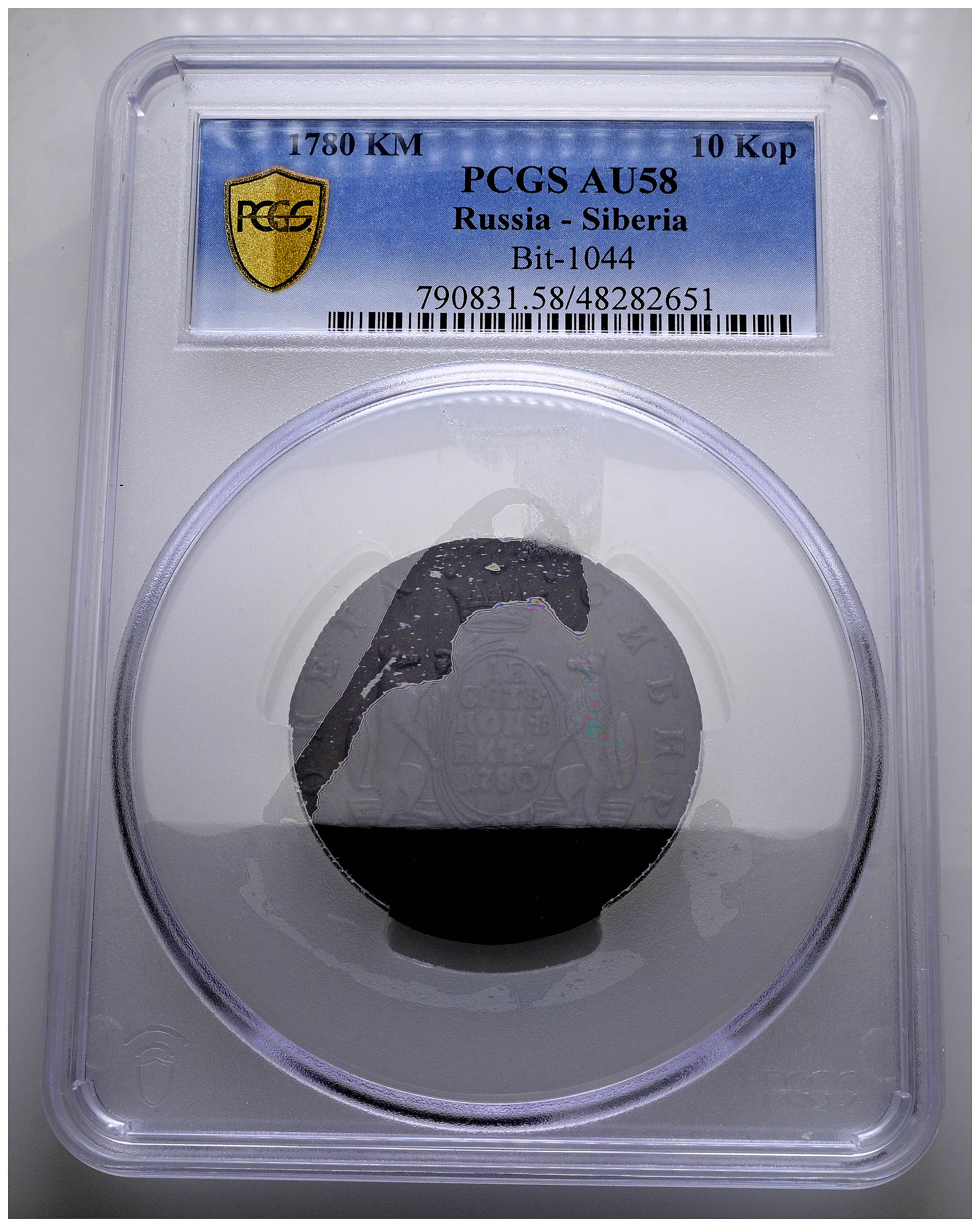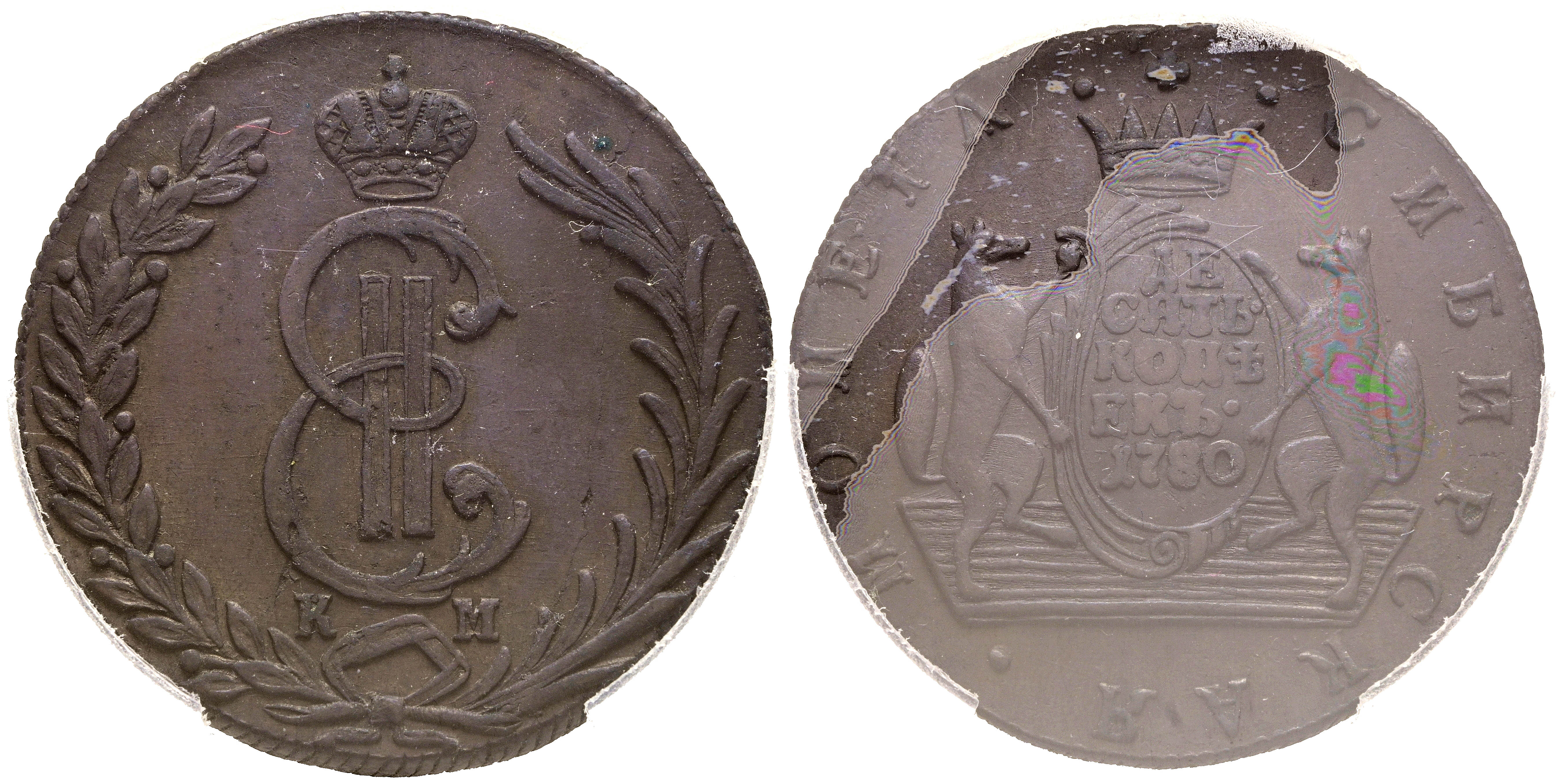 RUSIA, Catalina II (1762-1796). 10 Kopeks. (Ae. 65,50g/45mm)*. 1780. Suzun KM (Siberia). (Km#C6). Encapsulada por PCGS AU 58. Escasa. *Peso y medidas teóricos.