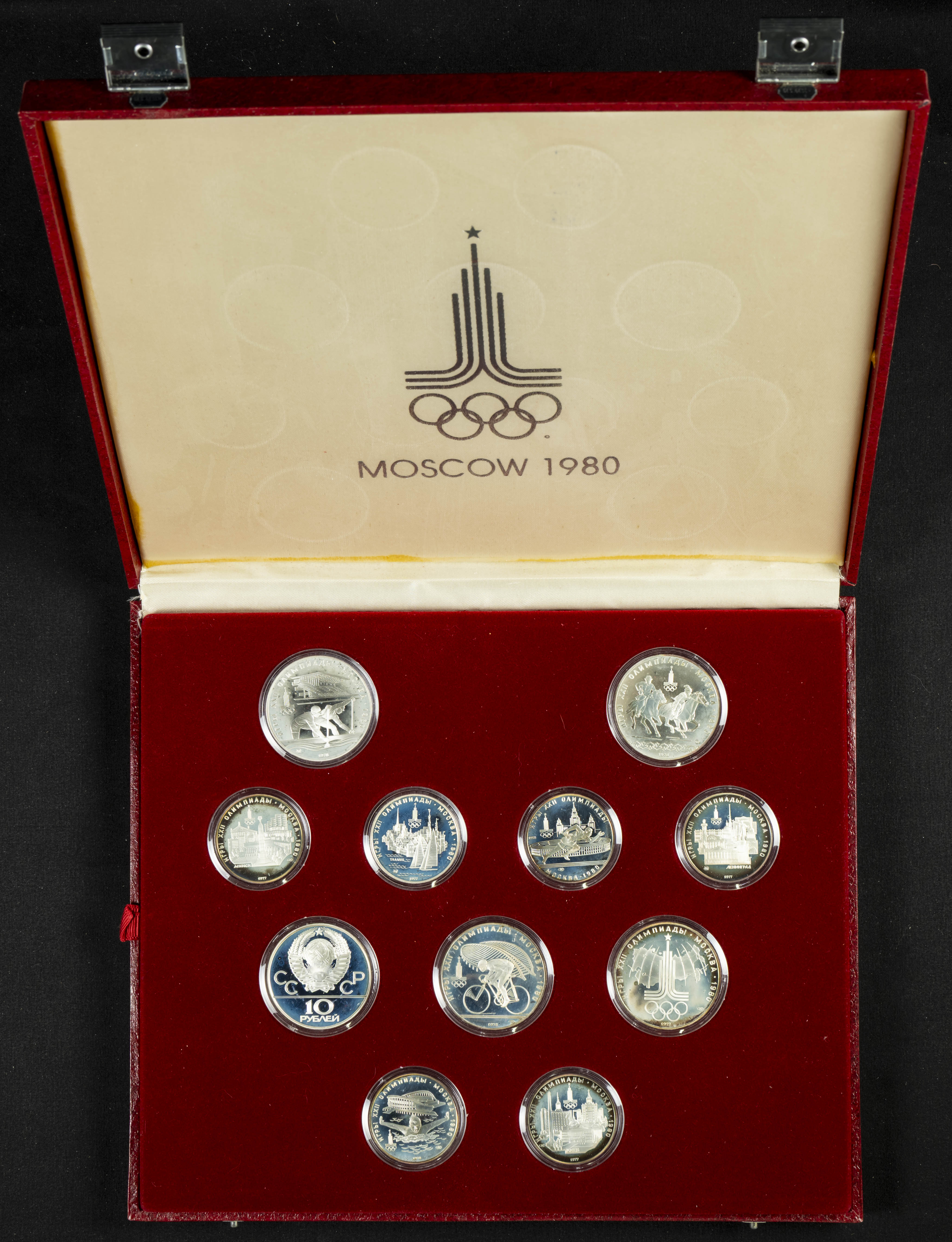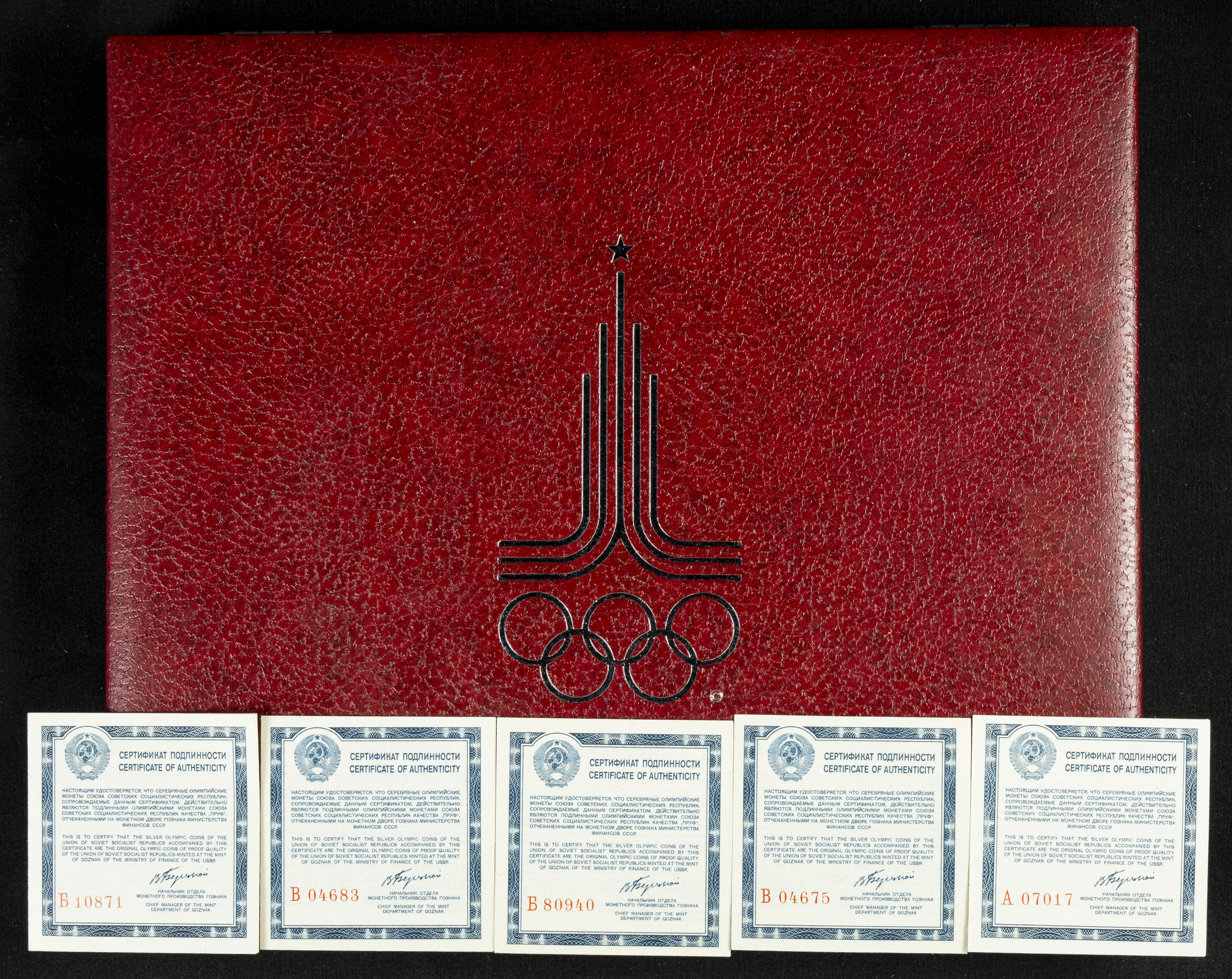 RUSIA. Estuche completo formado por 28 monedas de plata: 5 Rublos (14) y 10 Rublos (14). Juegos Olímpicos de Moscú. 1980. PROOF. Incluye 5 certificados de autenticidad. Colección completa.