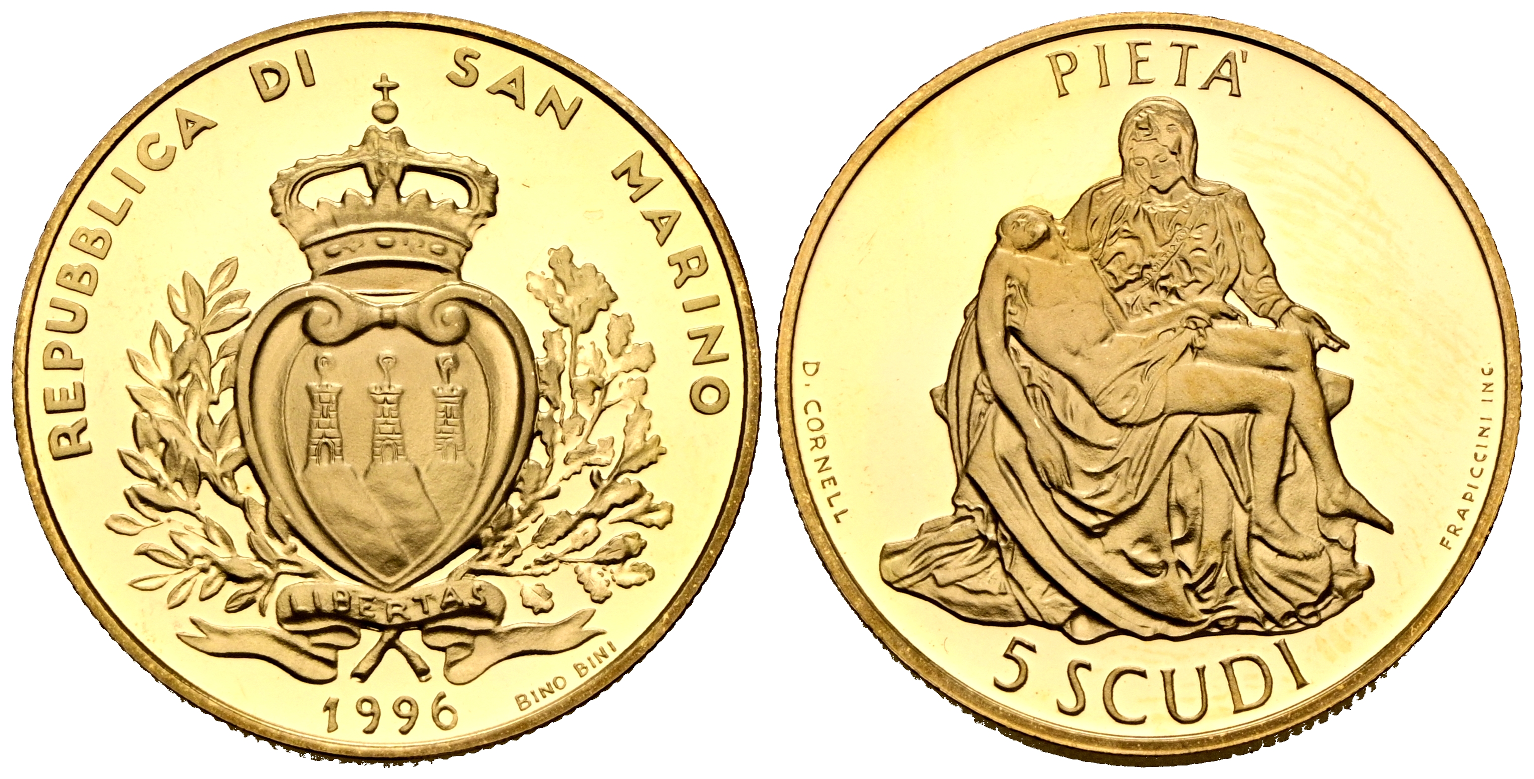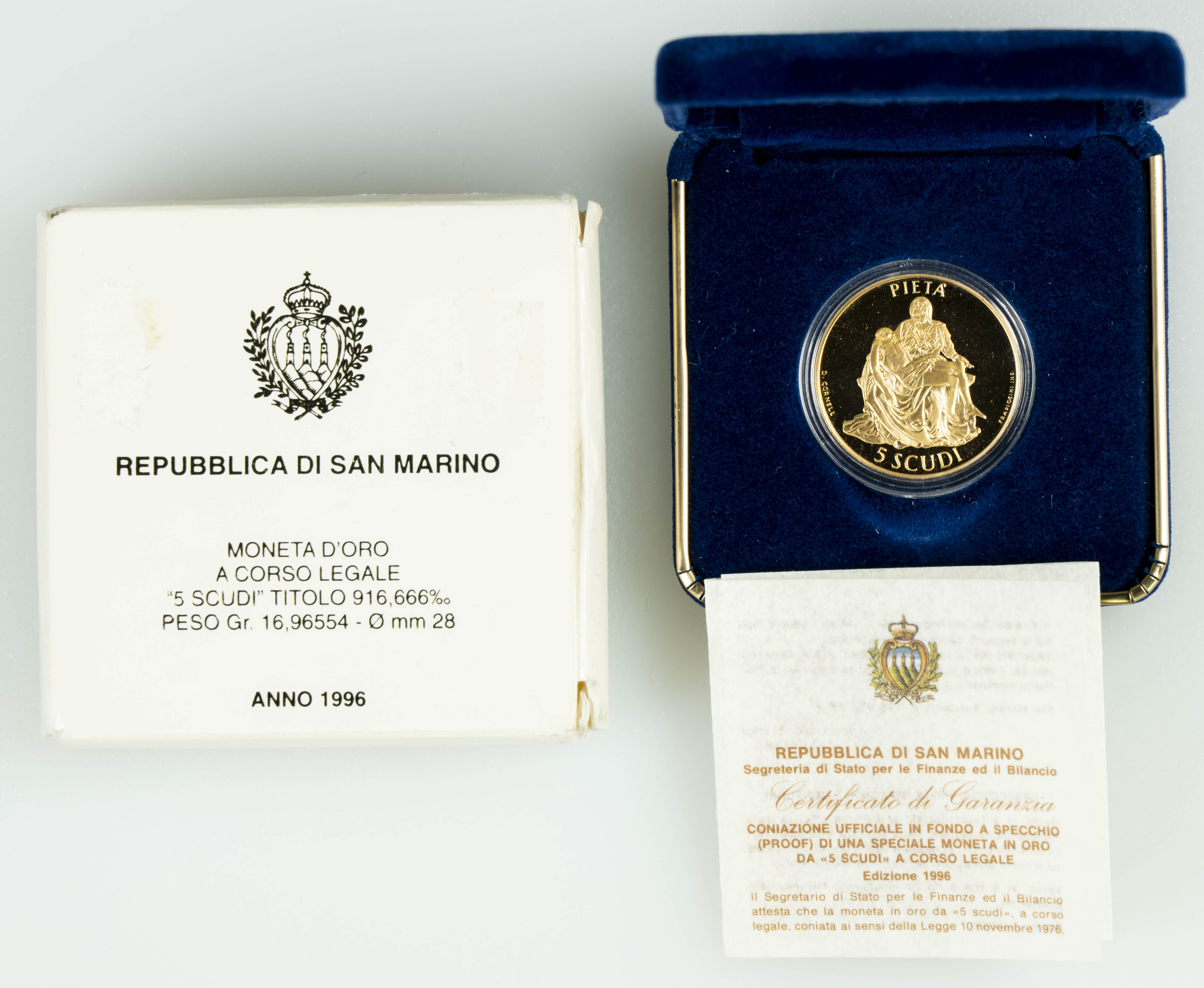 SAN MARINO. 5 Escudos. (Au. 16,97g/28mm). 1996. FDC. Presentado en estcuhe oficial deteriorado, incluye el certificado original.