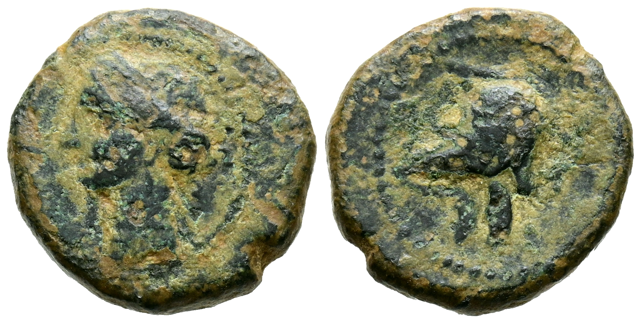 CARTAGONOVA (Cartagena, Murcia). 1/4 Calco. (Ae. 2,22g/14mm). 220-215 a.C. (FAB-521). Anv: Cabeza de Tanit a izquierda. Rev: Casco a izquierda. MBC-.