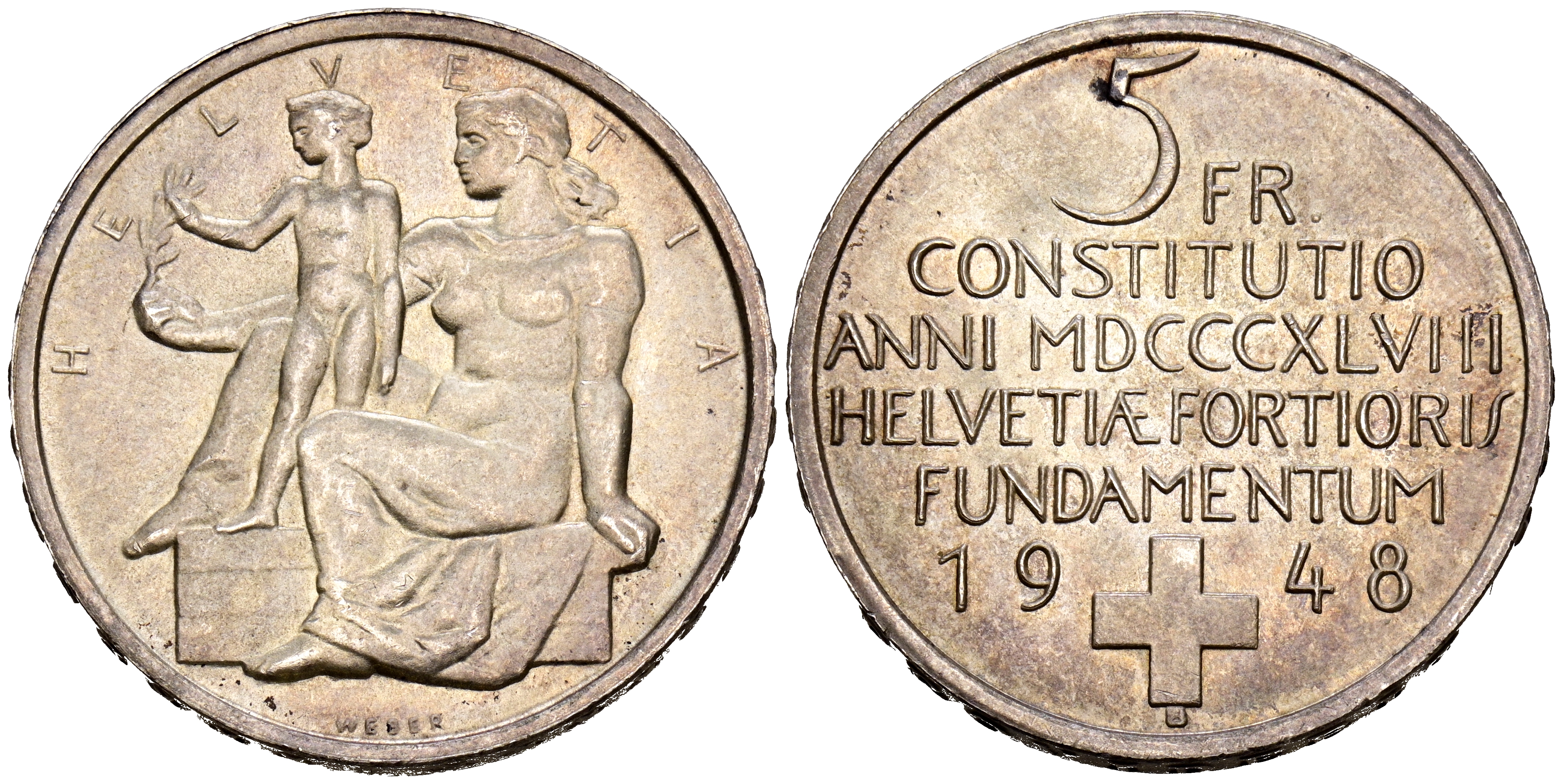 SUIZA. 5 Francos (Ar. 14,89g/31mm). 1948. Berna. Centenario de la Constitución. (Km#48). EBC+. Precioso tono.