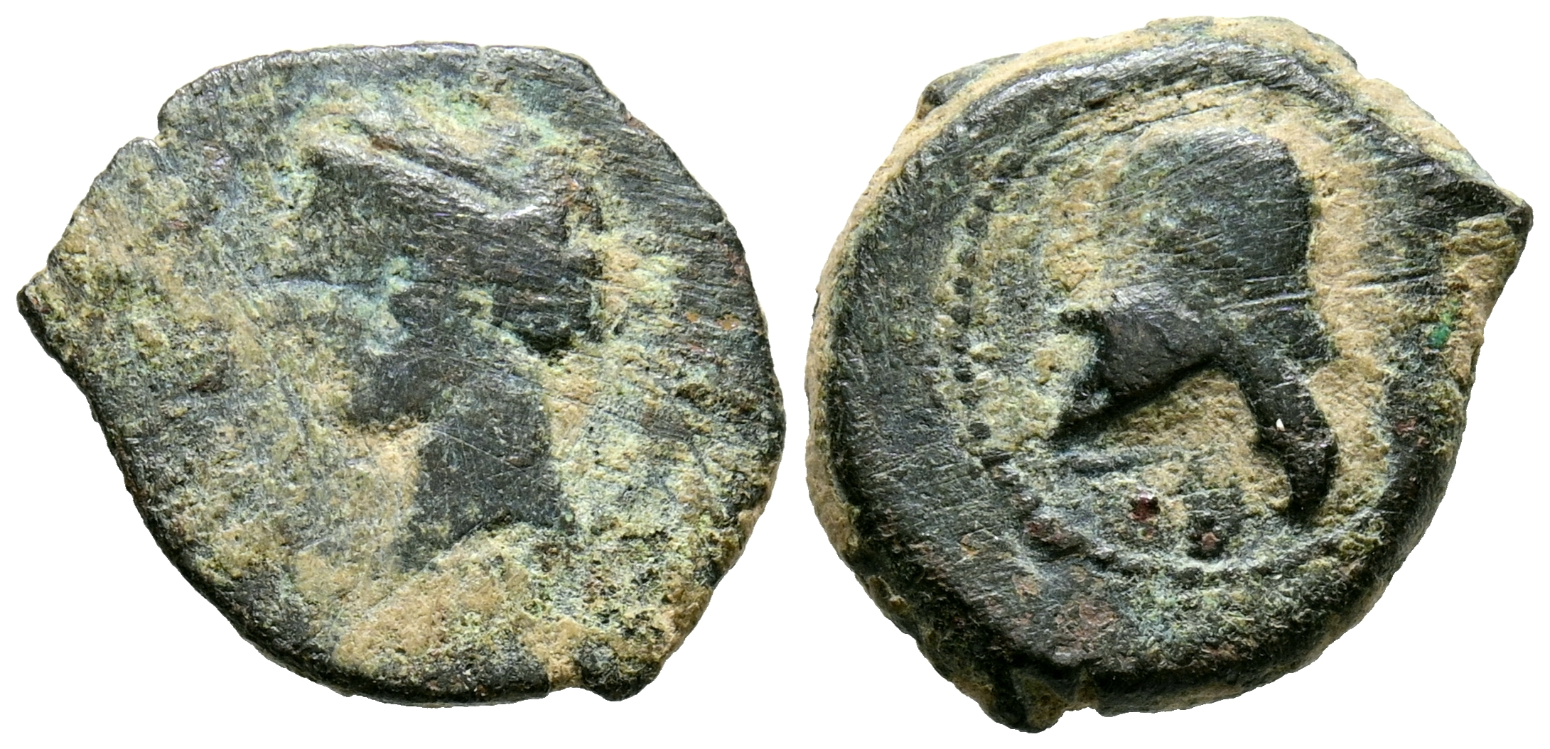 CARTAGONOVA (Cartagena, Murcia). 1/4 Calco. (Ae. 1,99g/15mm). 220-215 a.C. (FAB-521). Anv: Cabeza de Tanit a izquierda. Rev: Casco a izquierda. BC+/MBC.