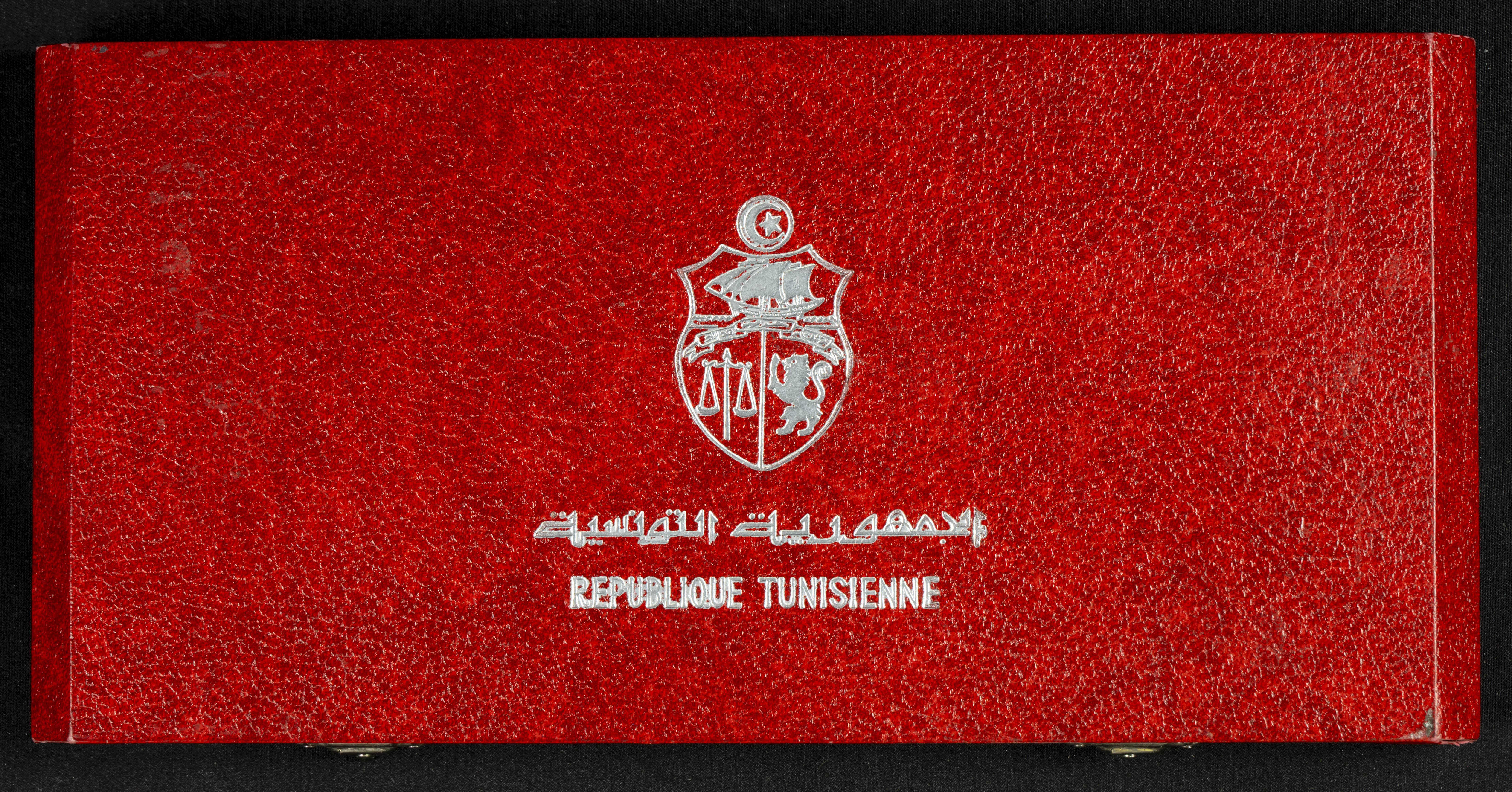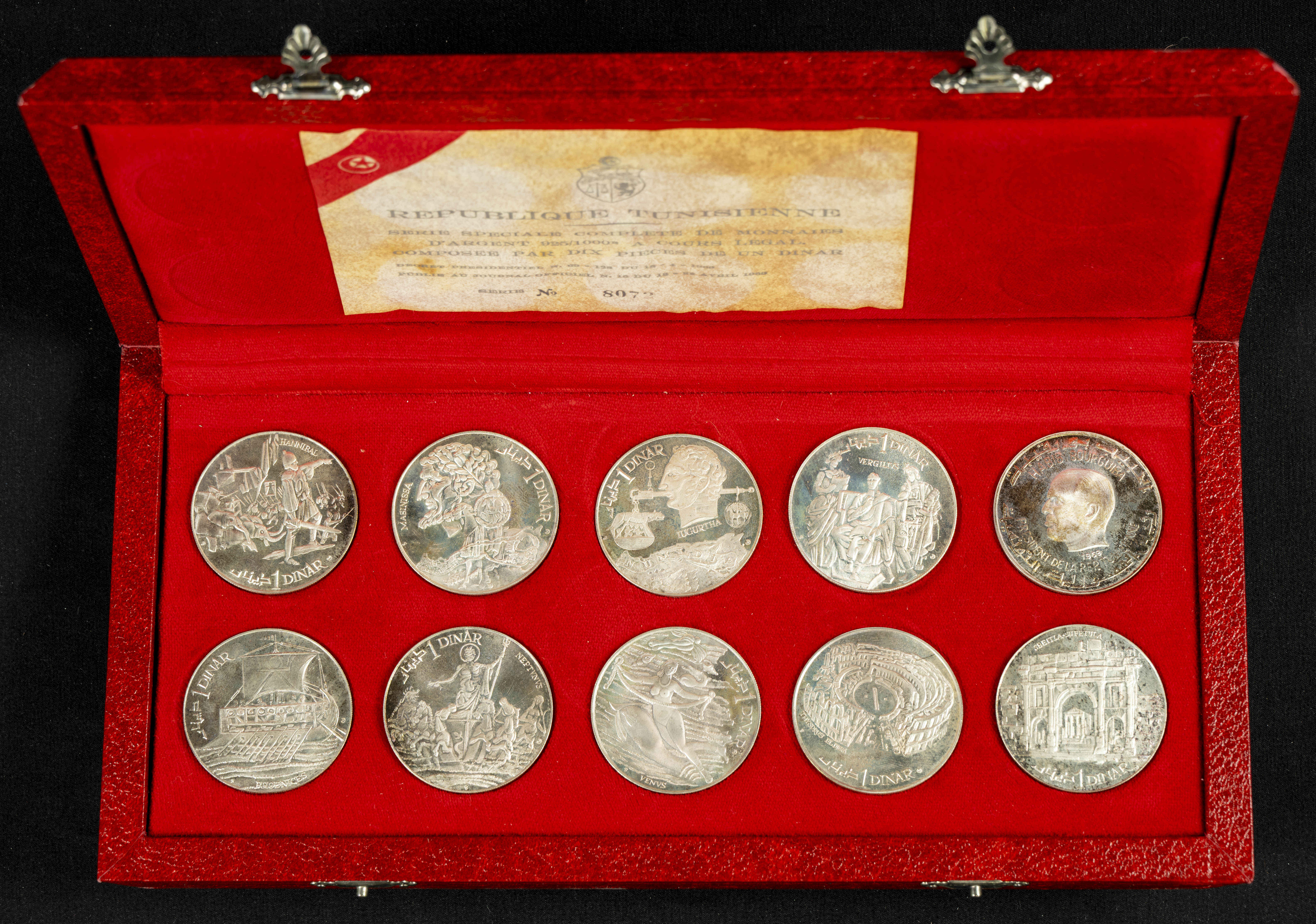 TÚNEZ. Estuche original compuesto por 10 monedas de 1 Dinar en plata. 1969. Serie Historia de Túnez. Franklin Mint y Numismática Italiana. Plata de 0,925 milésima. (Km#292-301). SC. Incluye certificado de autenticidad.