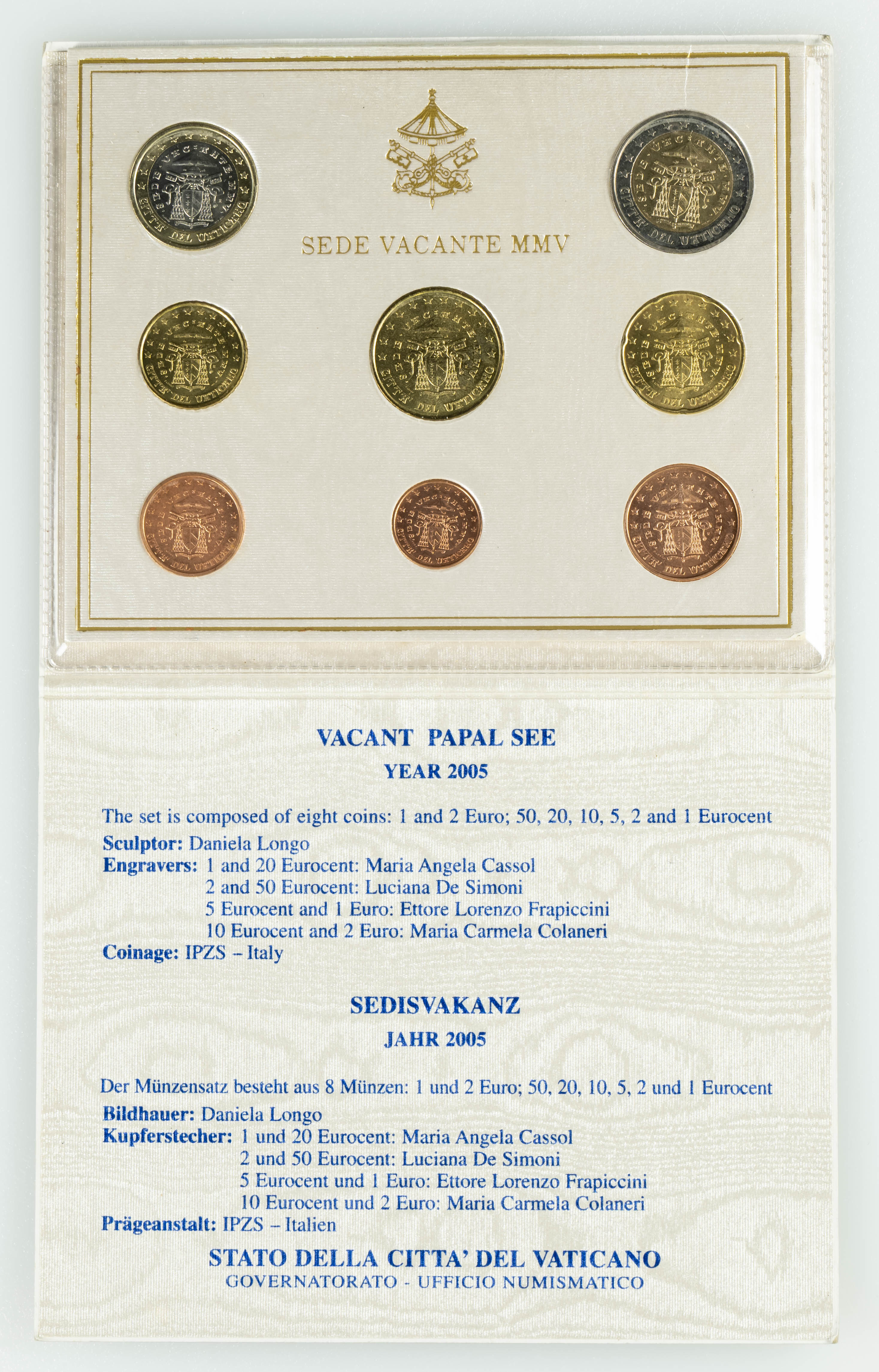 VATICANO. Set oficial completo con 8 valores comprendidos entre 1 Céntimo y 2 Euros. 2005. Sede Vacante. SC. Escasa.
