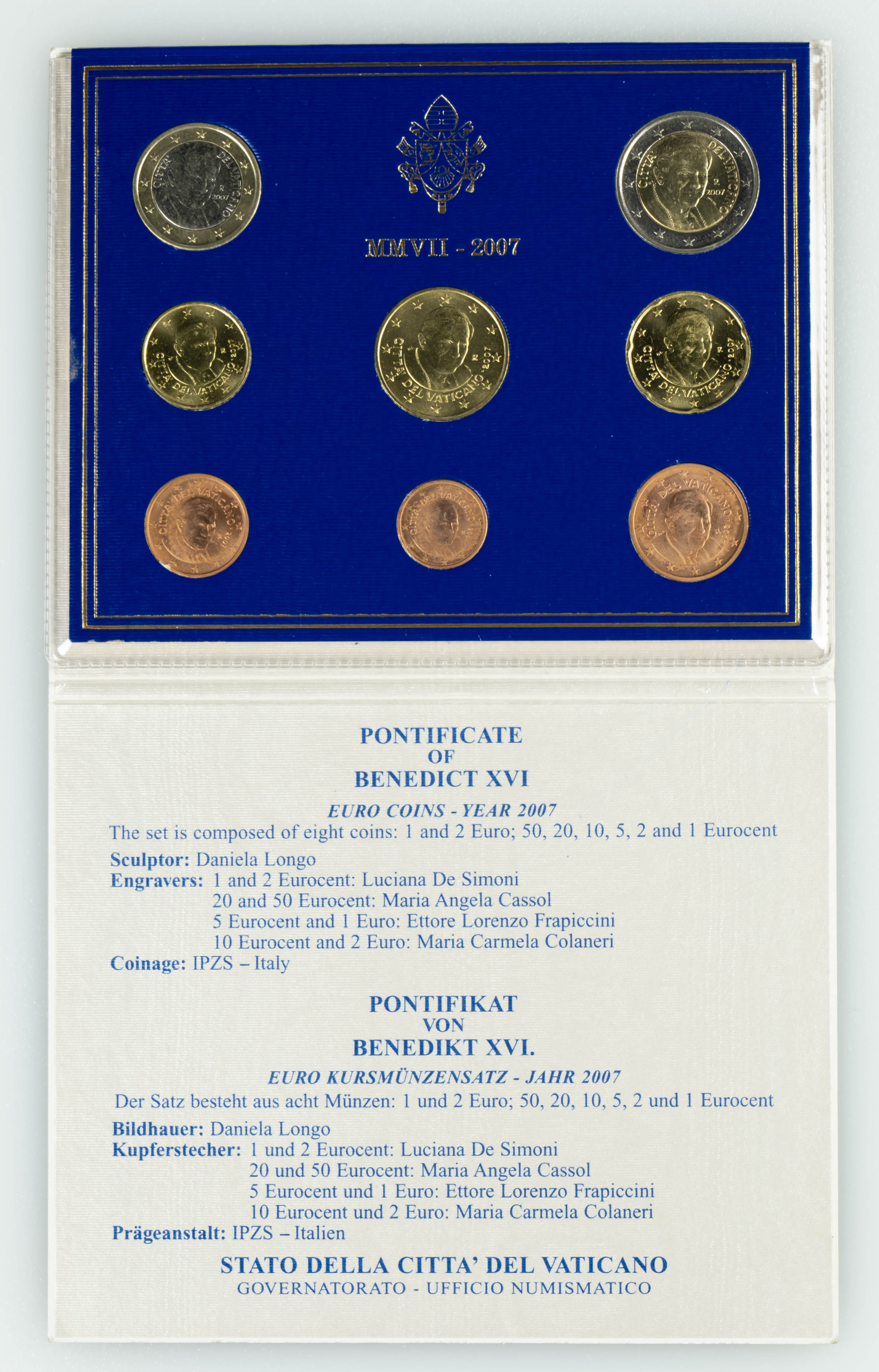 VATICANO. Set oficial completo con 8 valores comprendidos entre 1 Céntimo y 2 Euros. 2007. Benedicto XVI. SC.