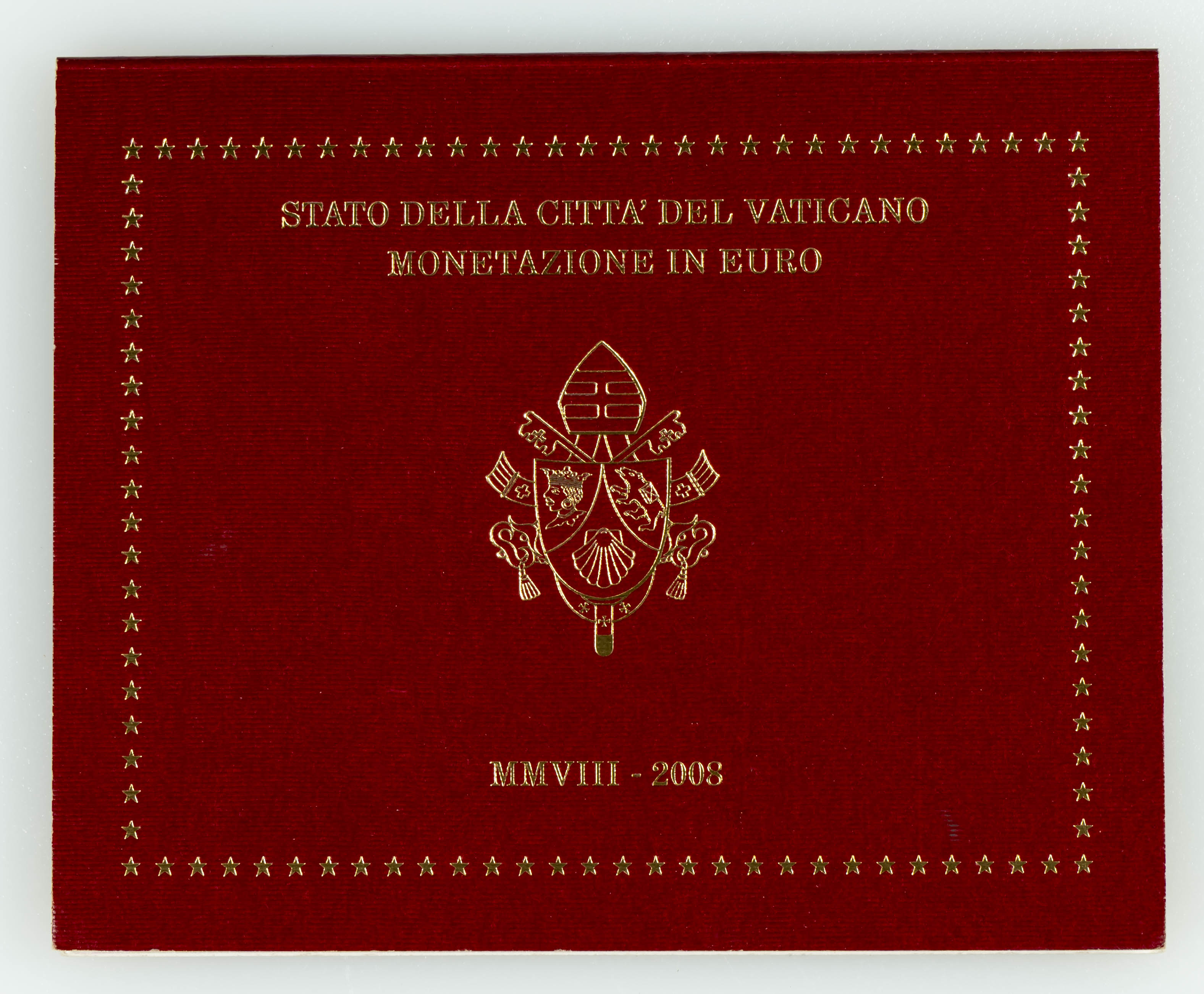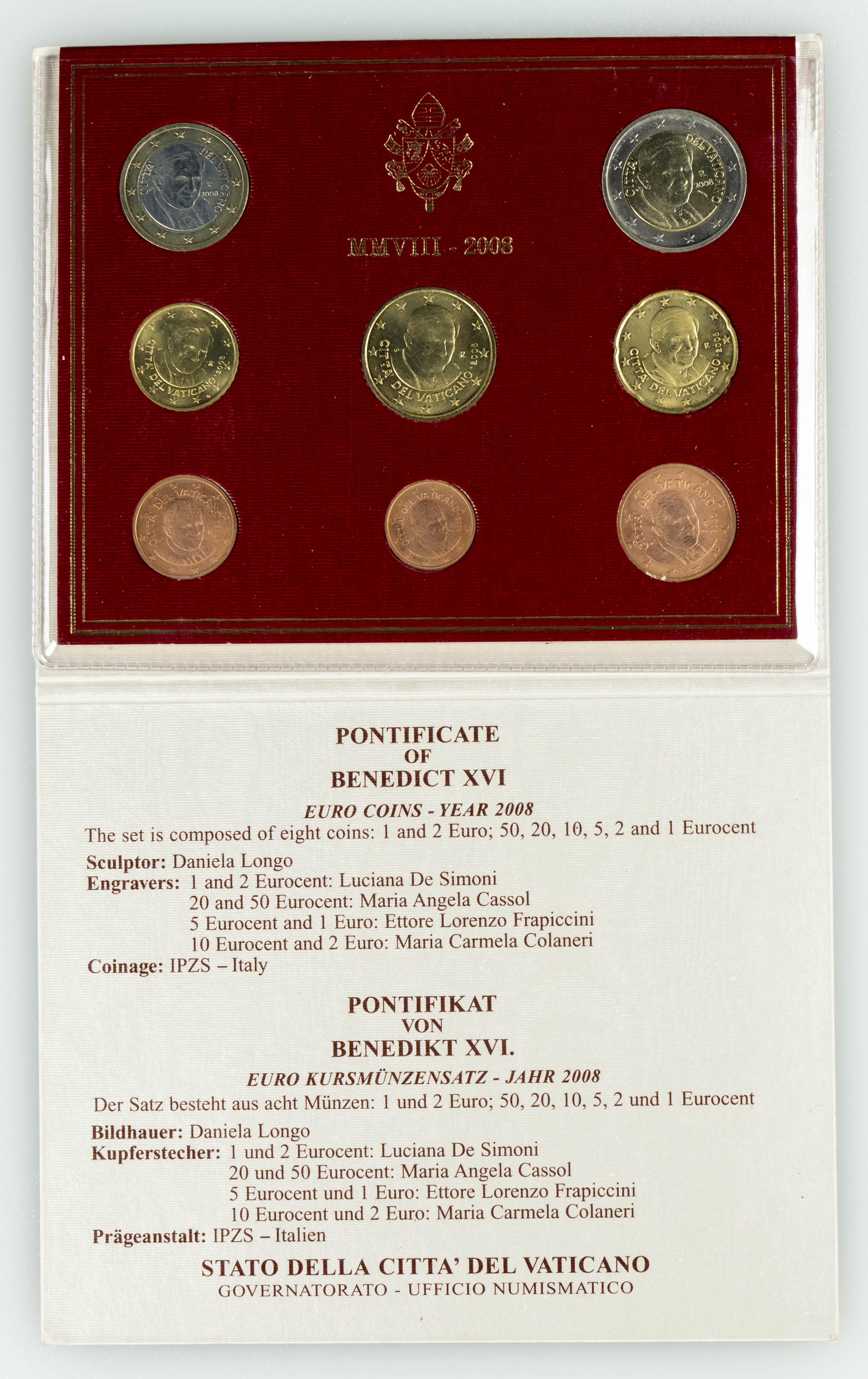 VATICANO, Benedicto XVI. Cartera completa de 8 valores de Euros correspondientes al año 2008. SC.
