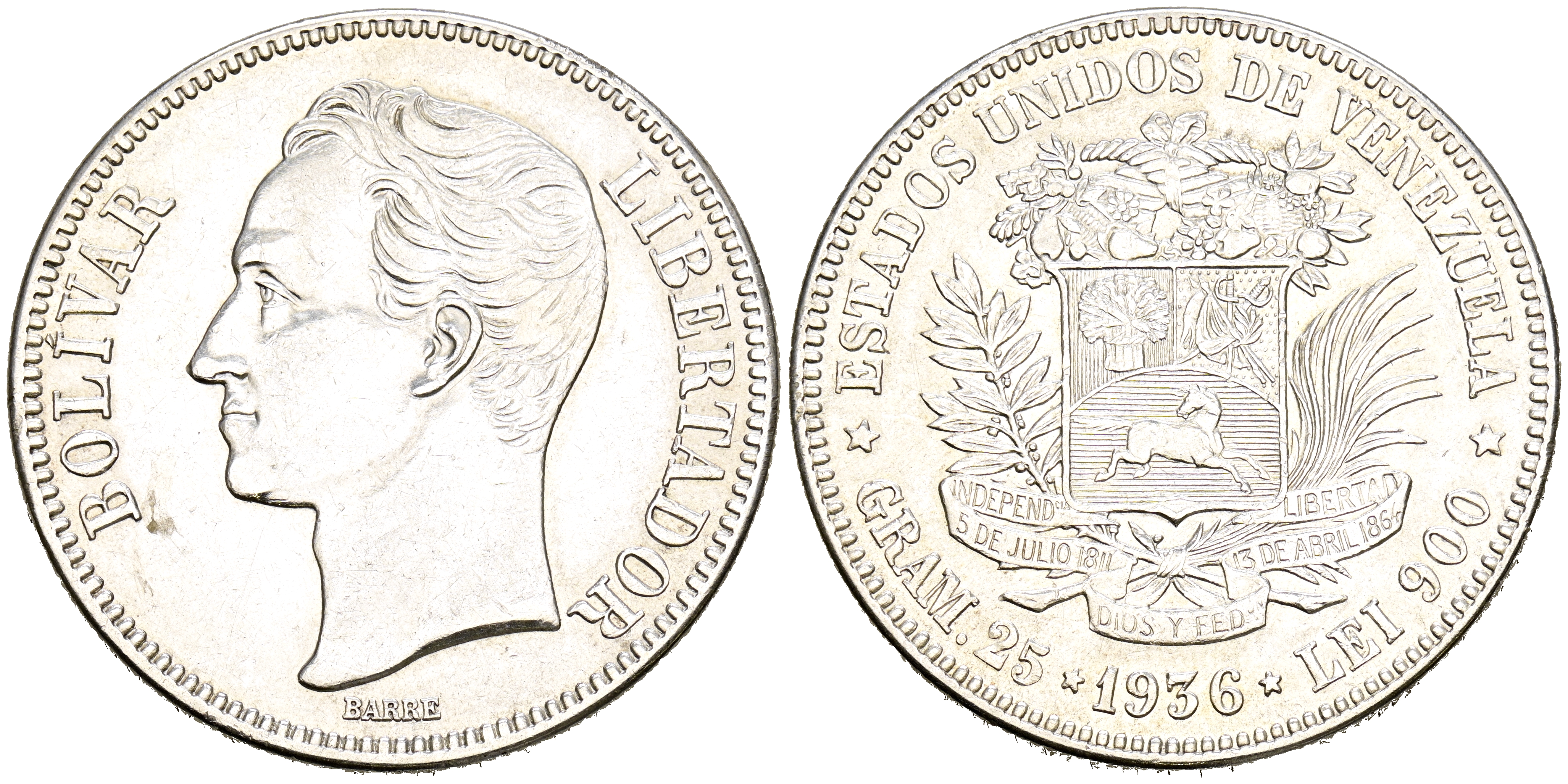 VENEZUELA. 5 Bolívares. (Ar. 24,89g/37mm). 1936. Philadelphia. (Km#24.2). EBC-.