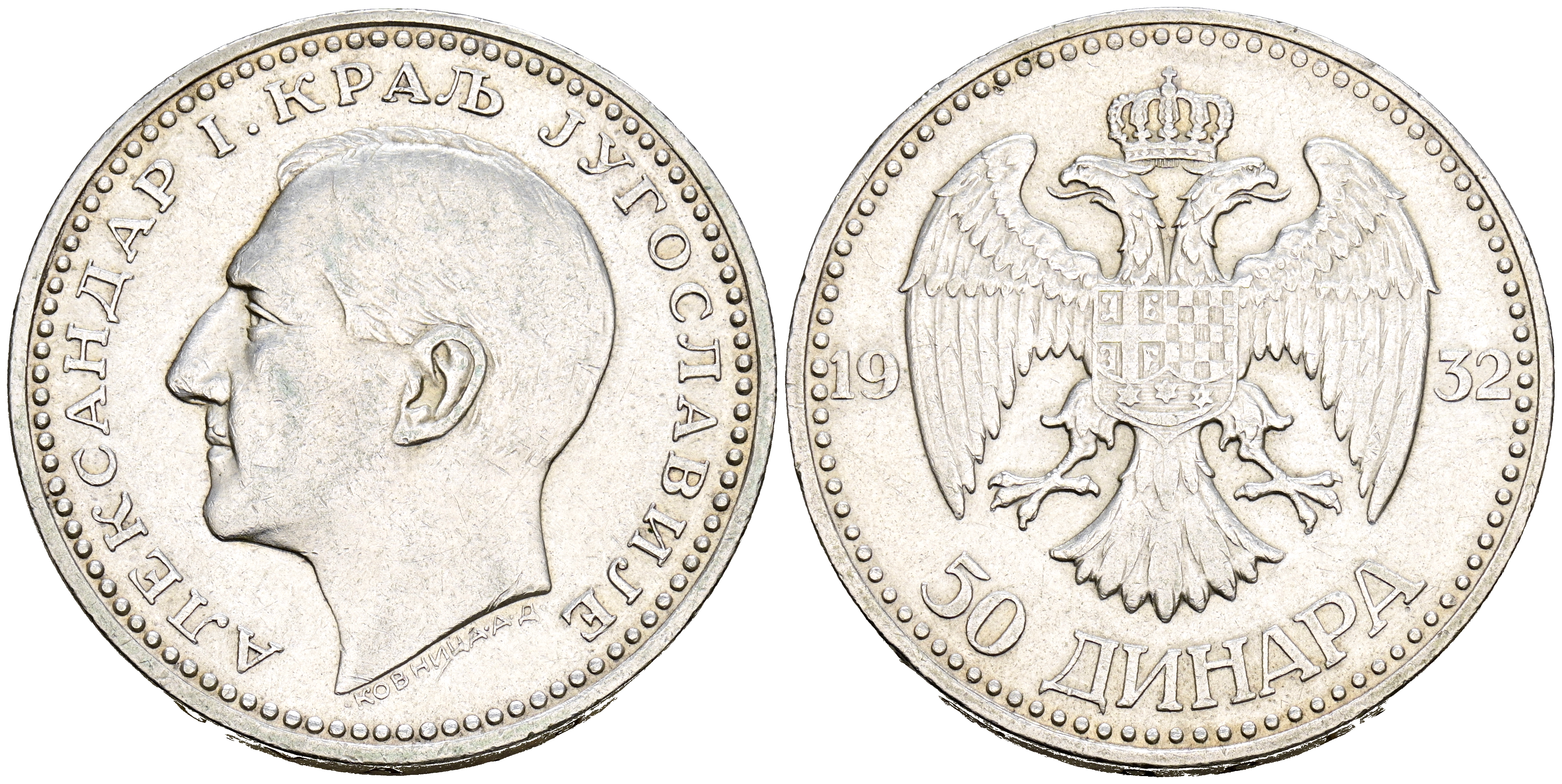 YUGOSLAVIA, Alexander I. 50 Dinara. (Ar. 22,94g/36mm). 1932. Belgrado (marca del grabador en el cuellos). (Km#16a). MBC+.