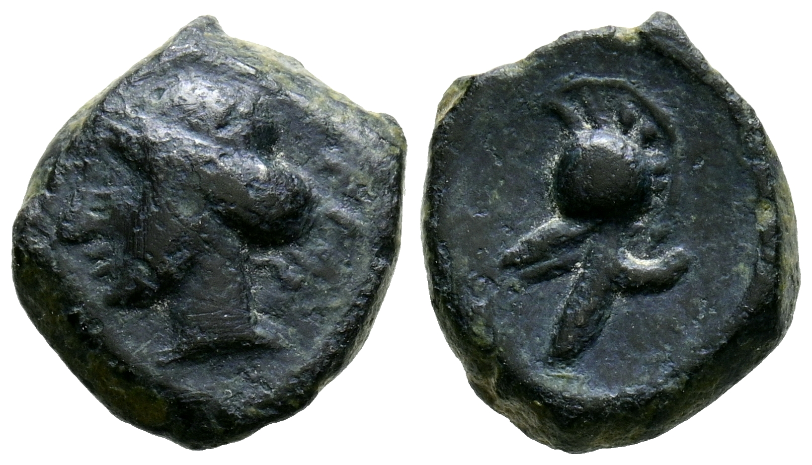 CARTAGONOVA (Cartagena, Murcia). 1/4 Calco. (Ae. 1,78g/13mm). 220-215 a.C. (FAB-523). Anv: Cabeza de Atenea a izquierda. Rev: Casco a izquierda. MBC.