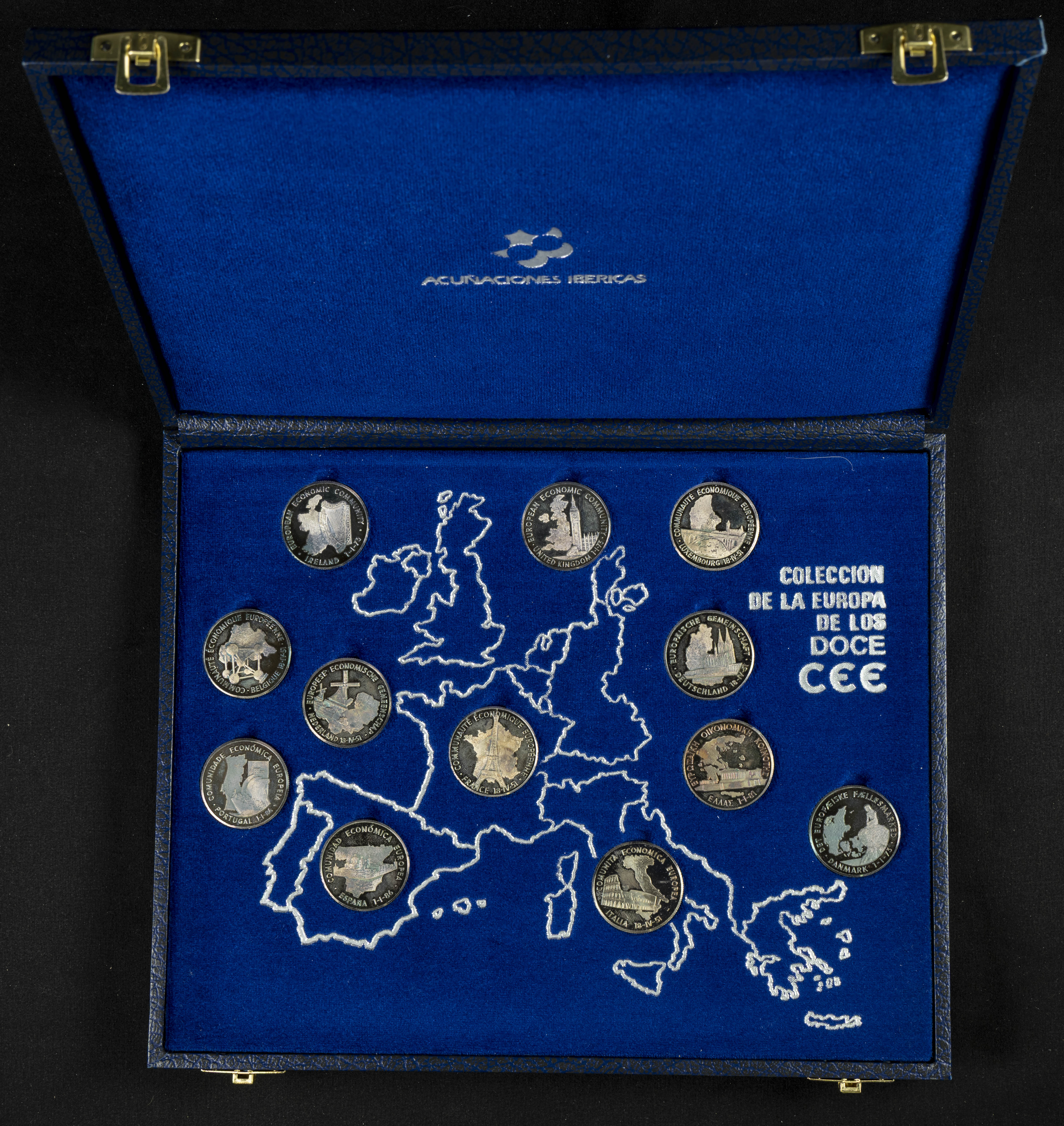 Colección de la Europa de los 12. Estuche compuesto por 12 medallas conmemorativas en plata de 0,999 milésimas y emitido por Acuñaciones Ibéricas. Peso total de las monedas: 162,80g. Diferentes estados de conservación. El estuche no cierra correctamente. A EXAMINAR.