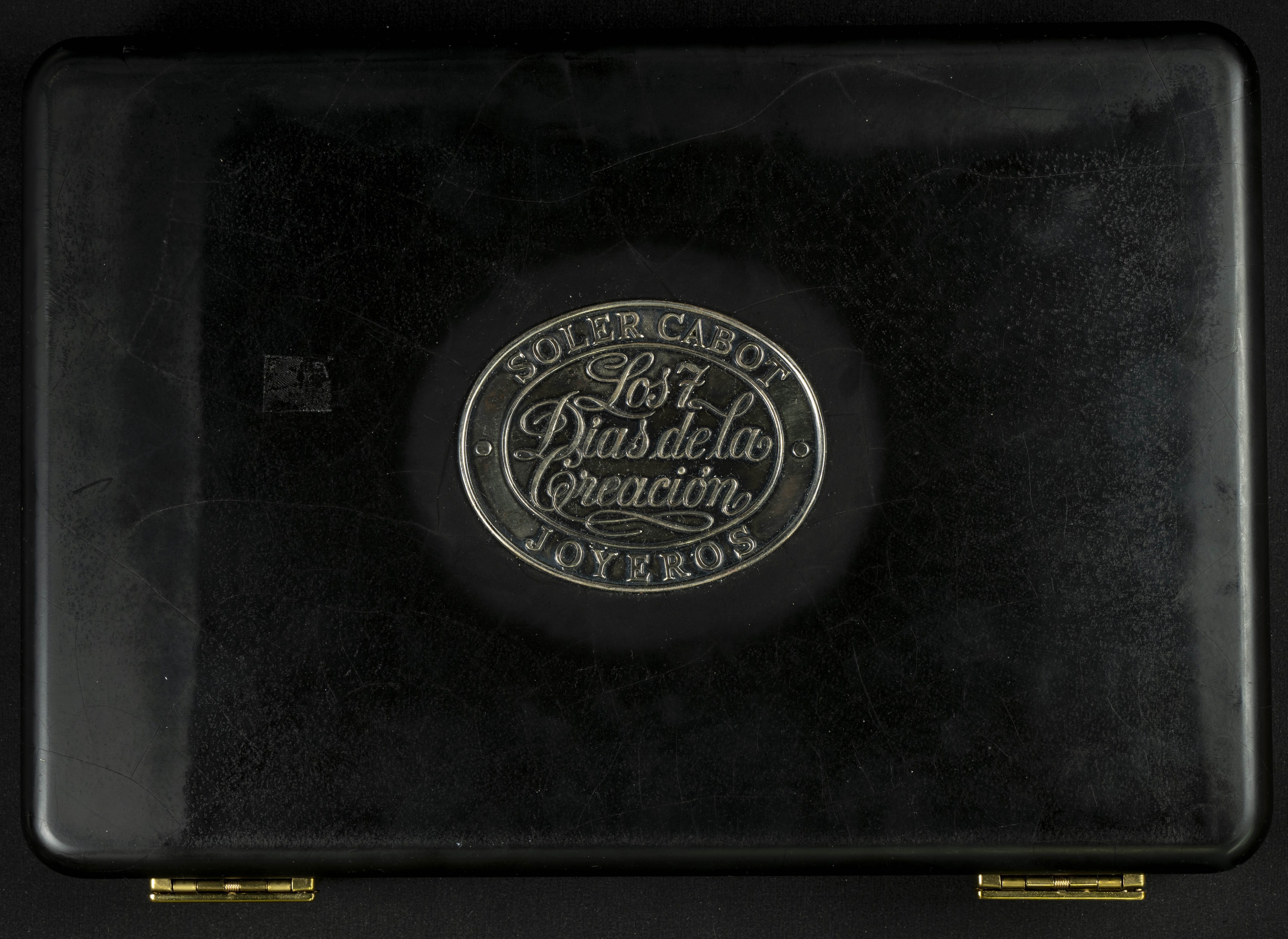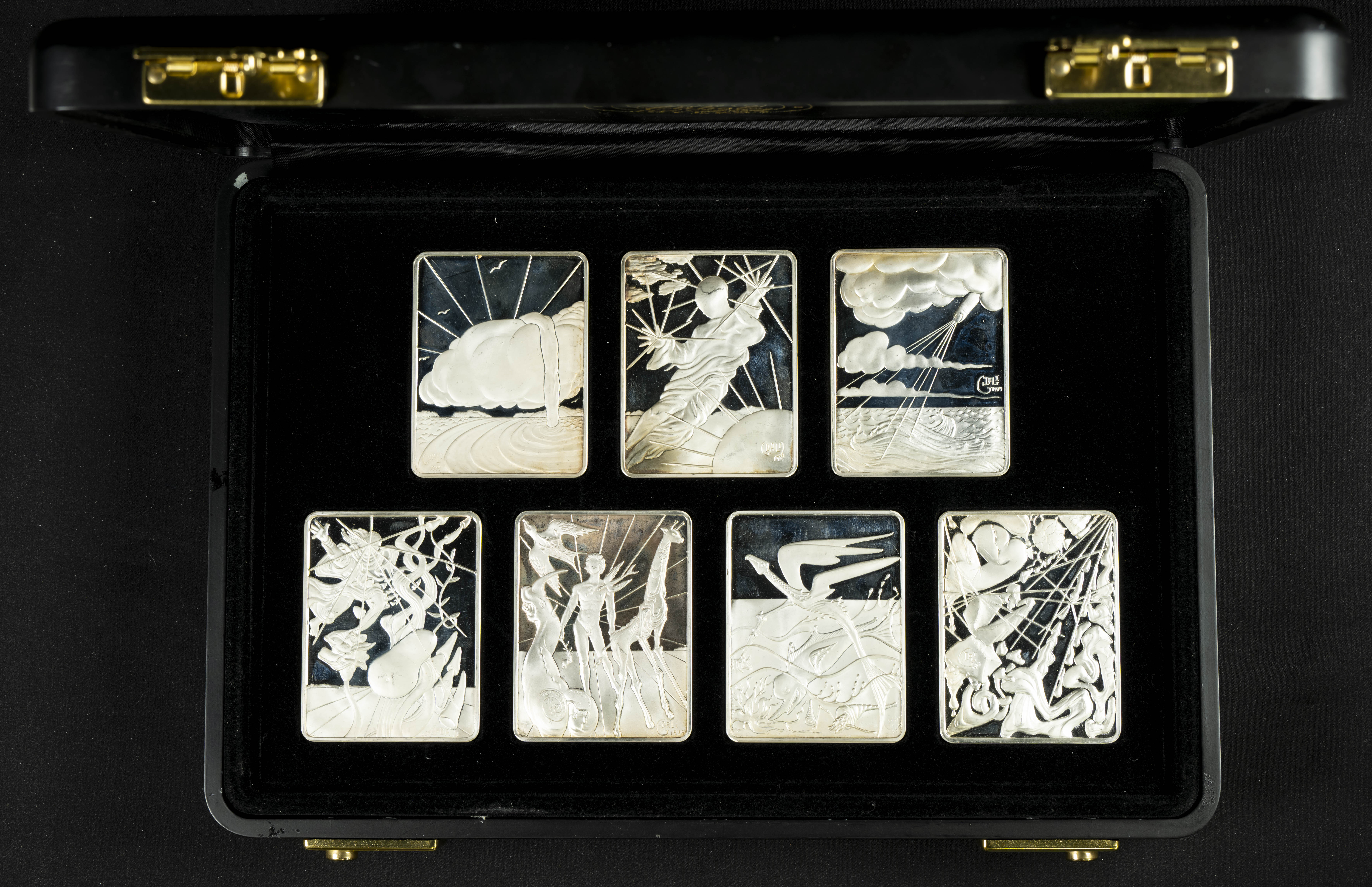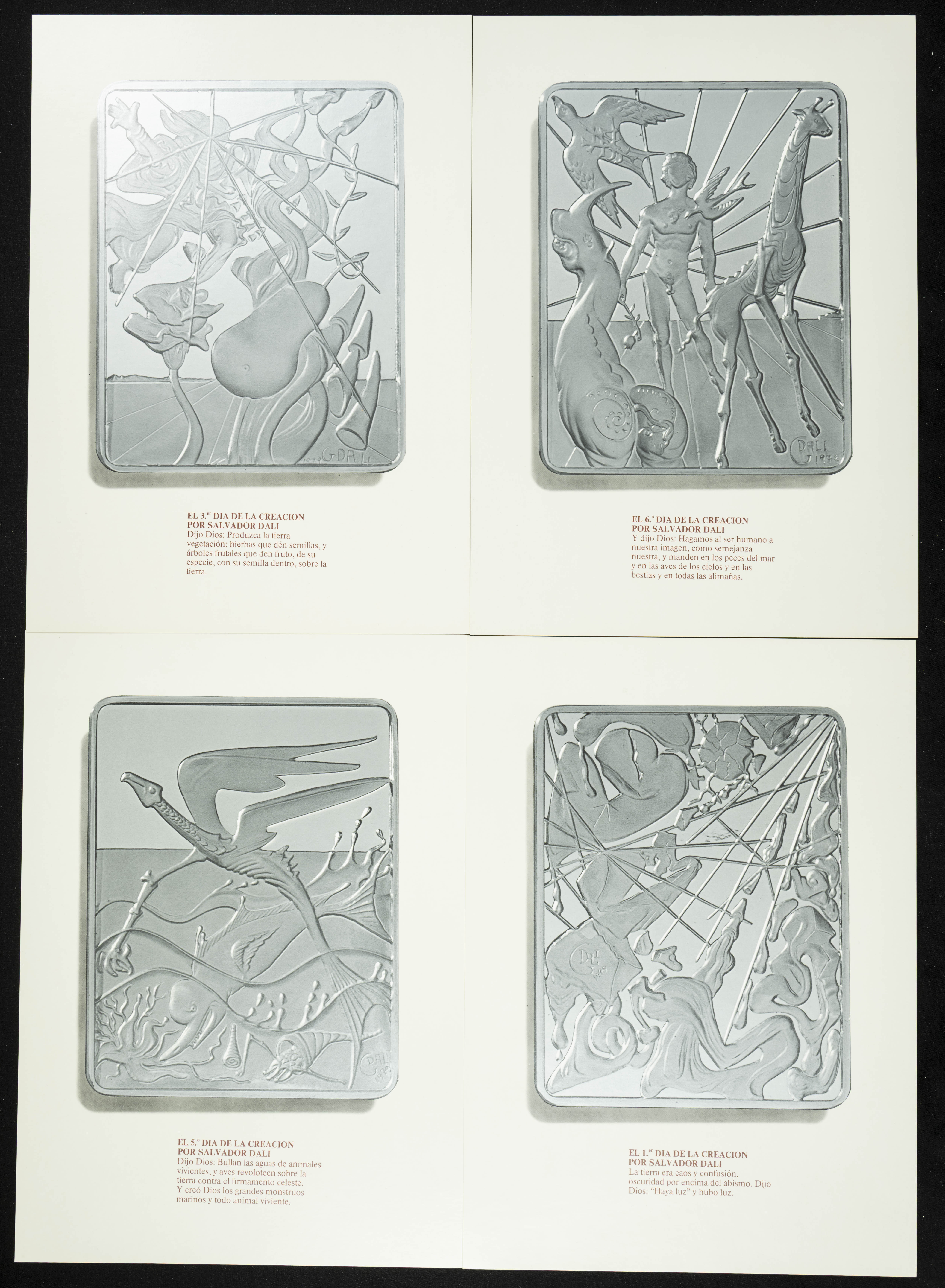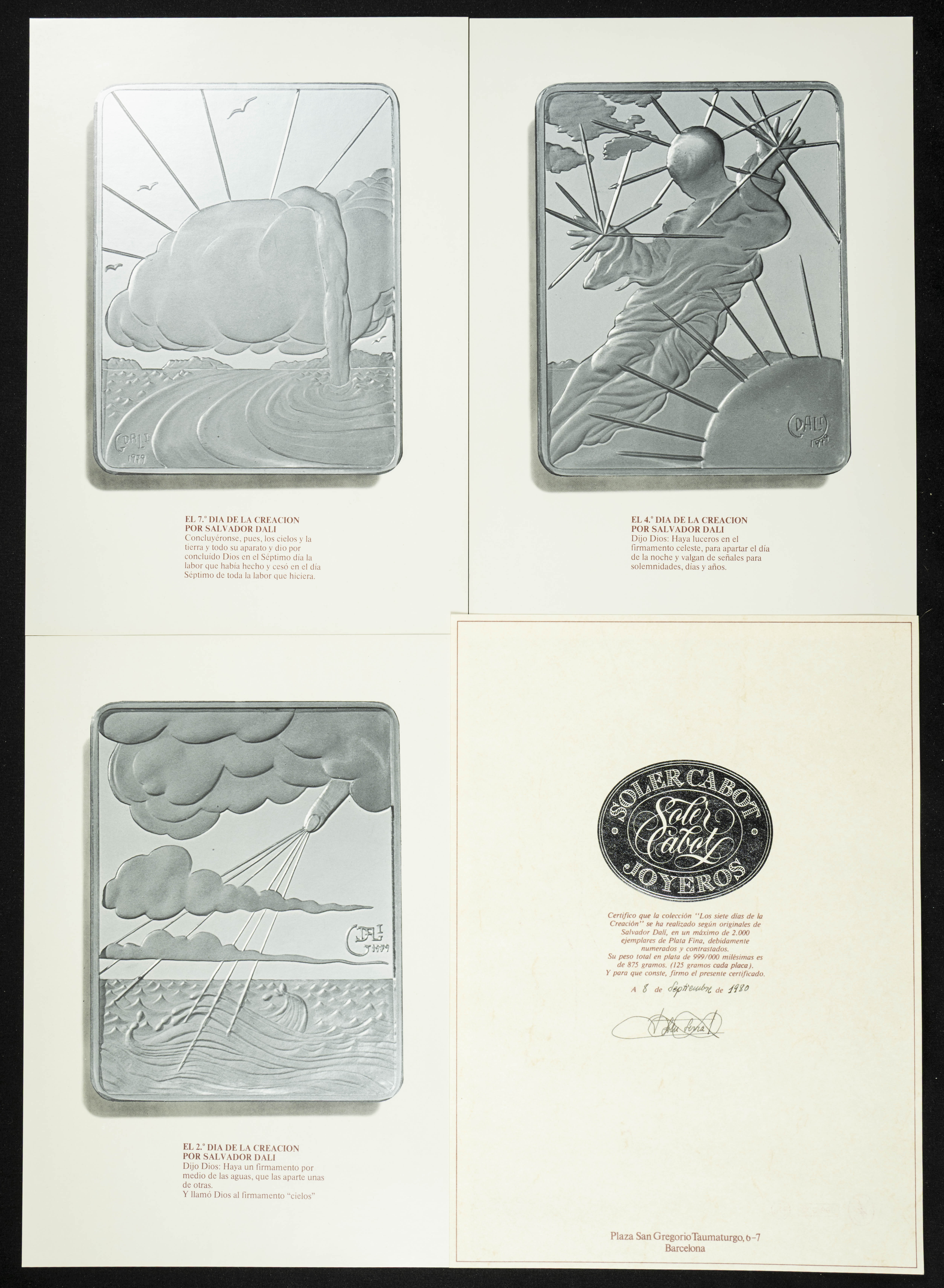 Salvador Dalí. Los 7 días de la creación. Conjunto formado por siete placas de plata pura, firmadas y numeradas. Medidas de cada una: 8 x 6 cm, peso medio individual aproximado: 124g (total de la colección en plata 870g aproximadamente). El conjunto se expone en su maletín original de Soler y Cabot Joyeros (Barcelona), incluyendo certificado de autenticidad y fichas explicativas de cada pieza. Tirada de sólo 5000 ejemplares.