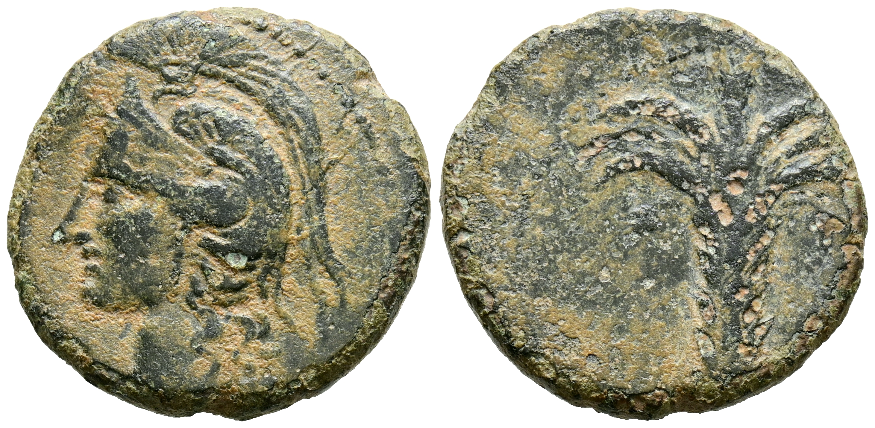 CARTAGONOVA (Cartagena, Murcia). 1/2 Calco. (Ae. 5,21g/20mm). 220-215 a.C. (FAB-532). Anv: Cabeza de Atenas con casco crestado a izquierda. Rev: Palmera. MBC-.
