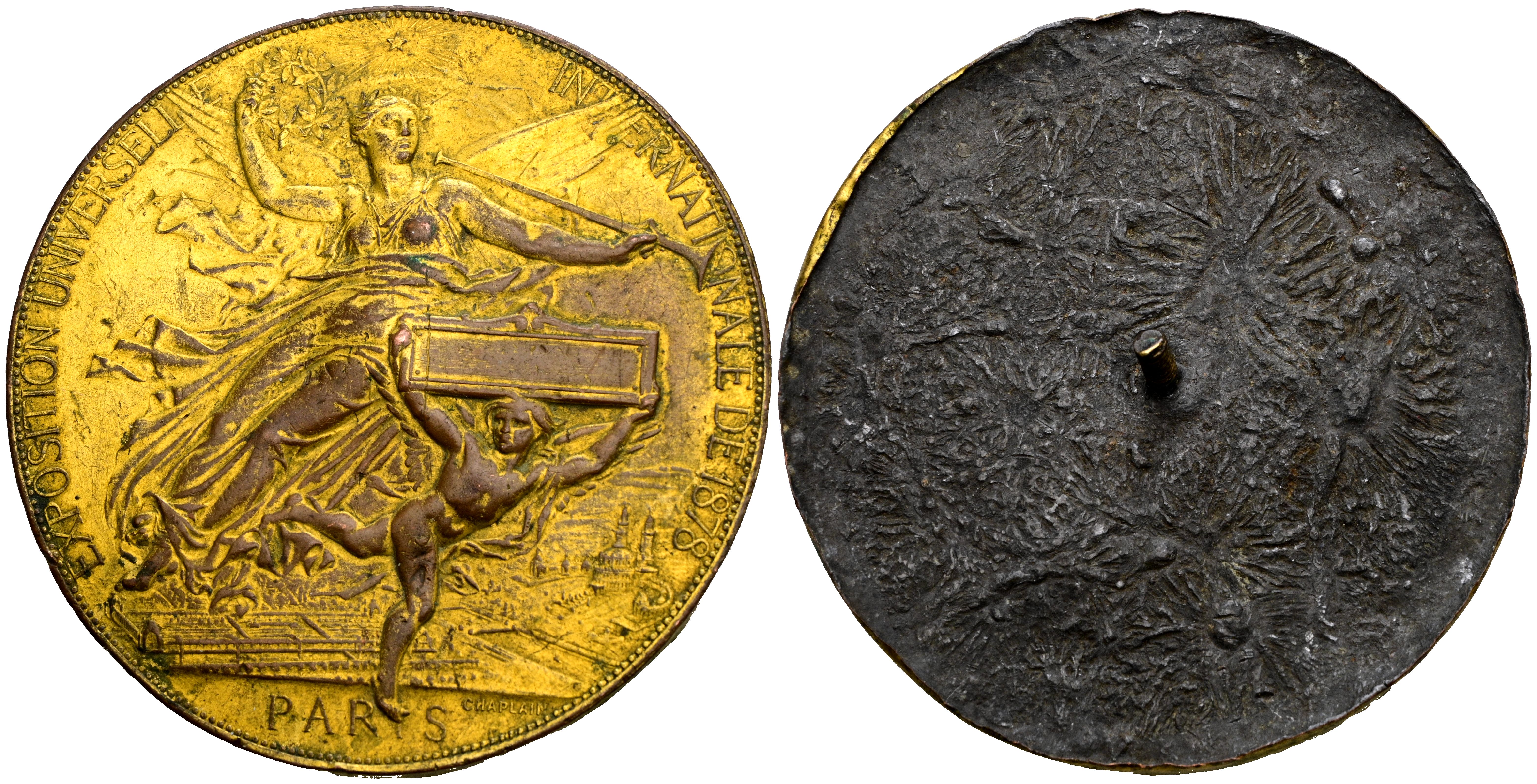 FRANCIA. Exposición Universal de París. (Ae. 75,05g/66mm). 1878. Grabador: Chaplain (retratista oficial de todos los Presidentes de la Républica entre 1877 y 1889), Medalla unifaz, mostrando en anverso a Victoria sosteniendo cetro y triunfo, justo debajo Cupido sostienendo cartela (sin inscripción). MBC.