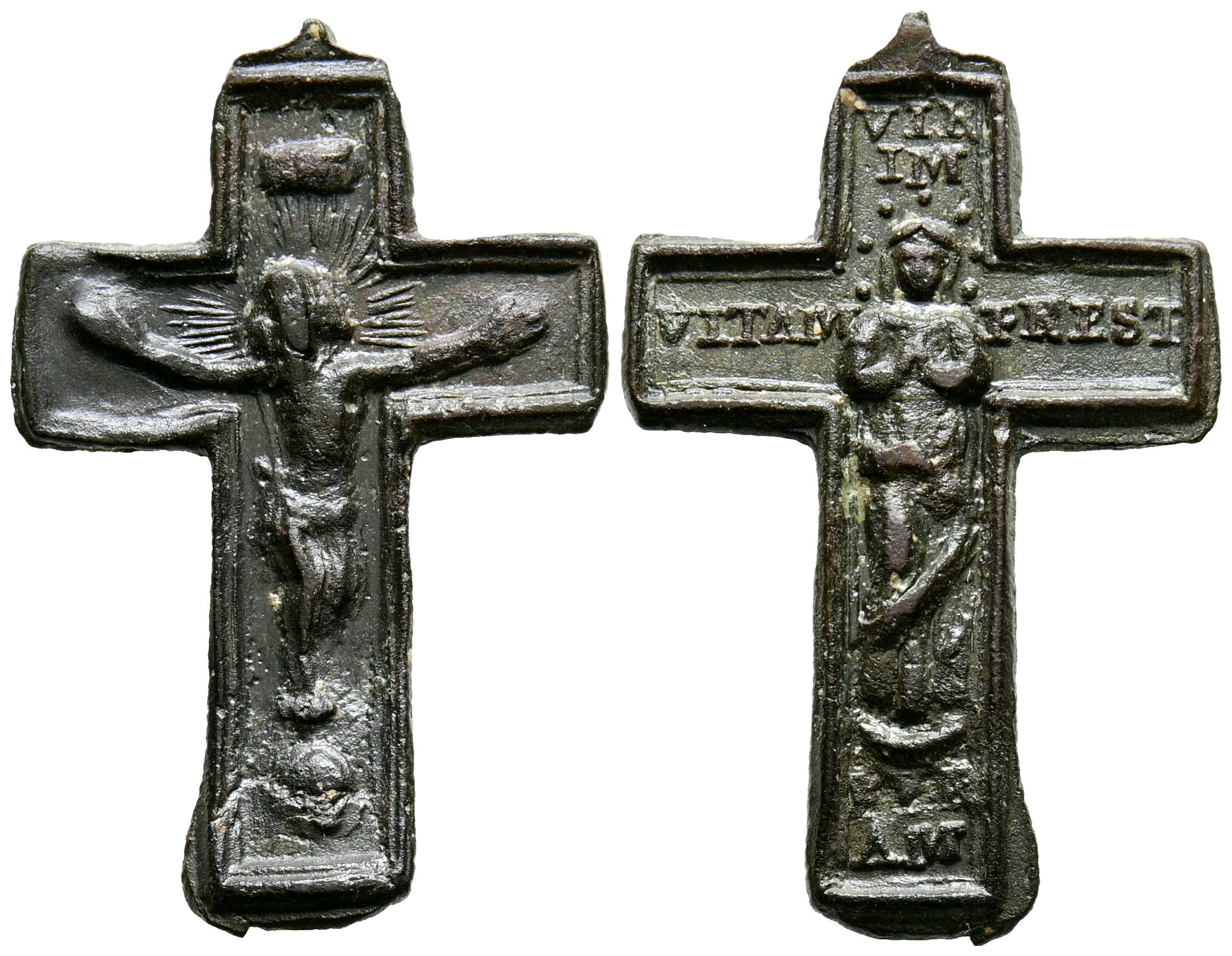 MEDALLA-CRUZ DEVOCIONAL. (Ae. 2,11g/28,5x18,5mm). Siglo XVIII-XIX. Roma. Anv: Cristo Crucificado. Rev: Inmaculada. EBC. Precioso ejemplar.