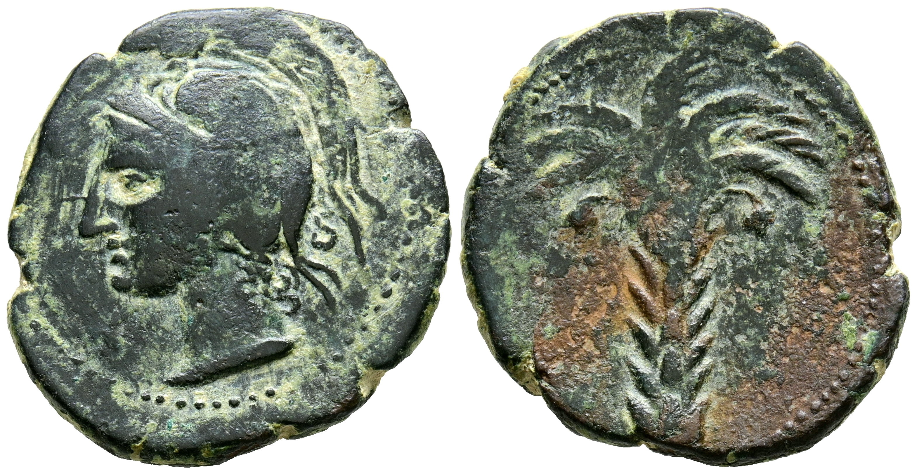 CARTAGONOVA (Cartagena, Murcia). 1/2 Calco. (Ae. 6,34g/24mm). 220-215 a.C. (FAB-533). Anv: Cabeza de Atenas con casco crestado a izquierda. Rev: Palmera. MBC.