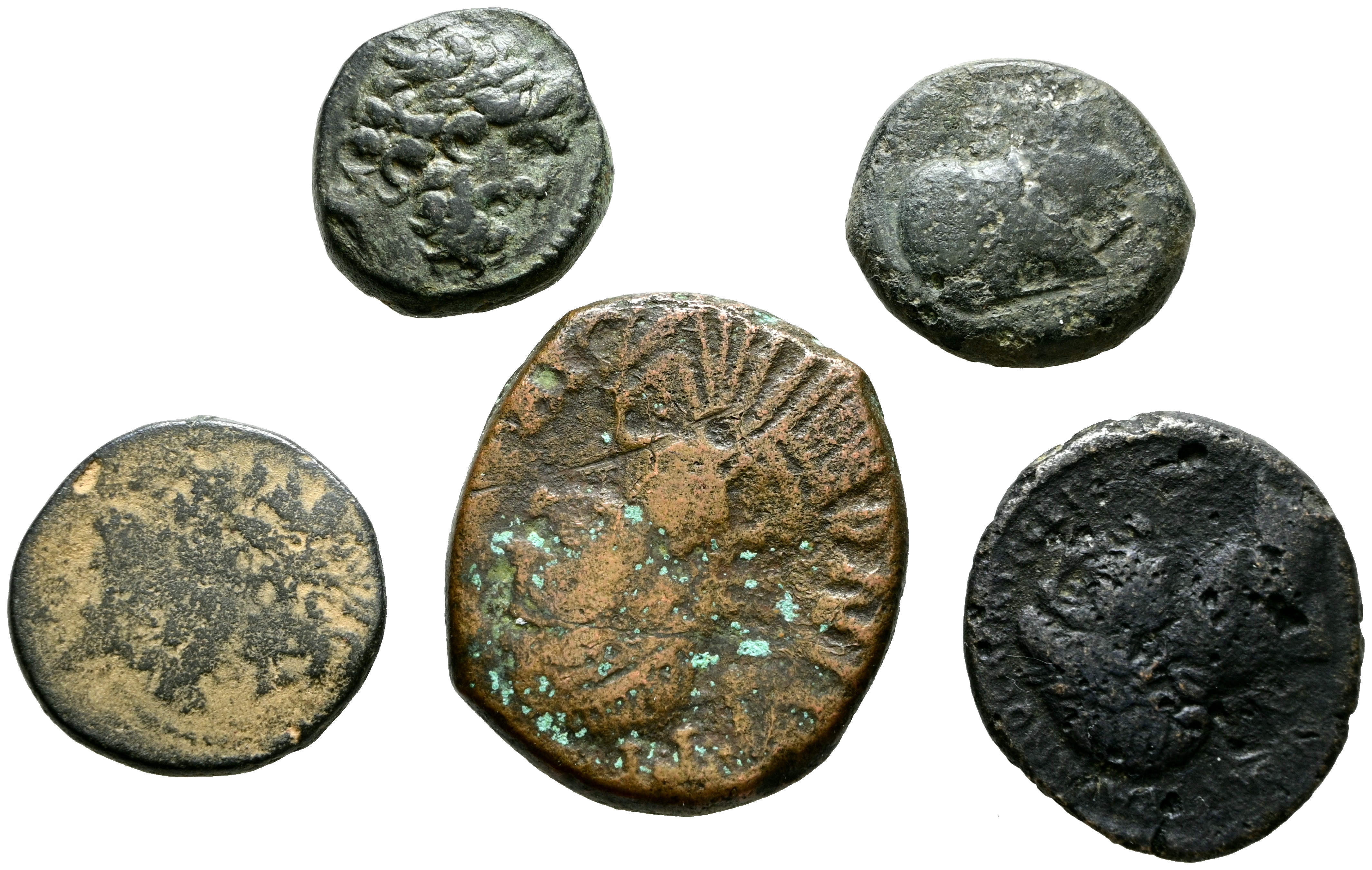 MUNDO ANTIGUO. Interesante cojunto formado por 5 bronces variados. Diferentes módulos, medidas y estados de conservación. A EXAMINAR.