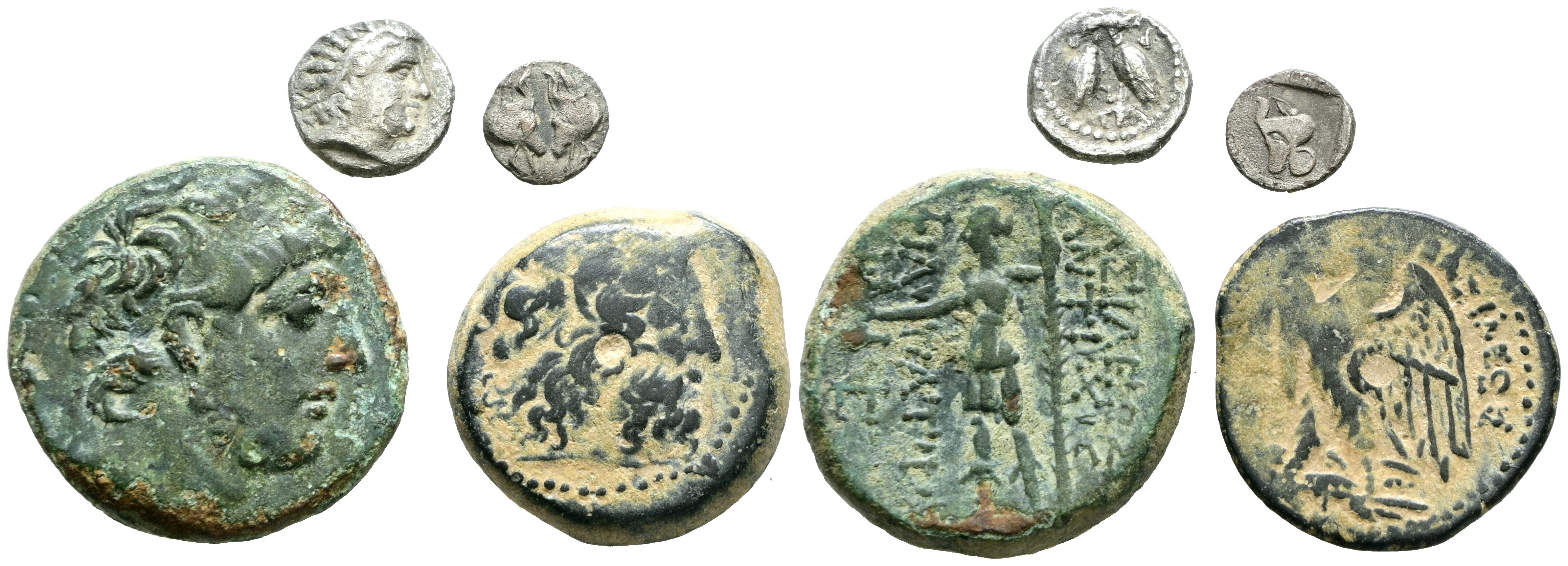 MONEDAS GRIEGAS. Interesante conjunto formado por 4 monedas variadas. Diferentes metales, emisores y estados de conservación. A EXMAINAR.