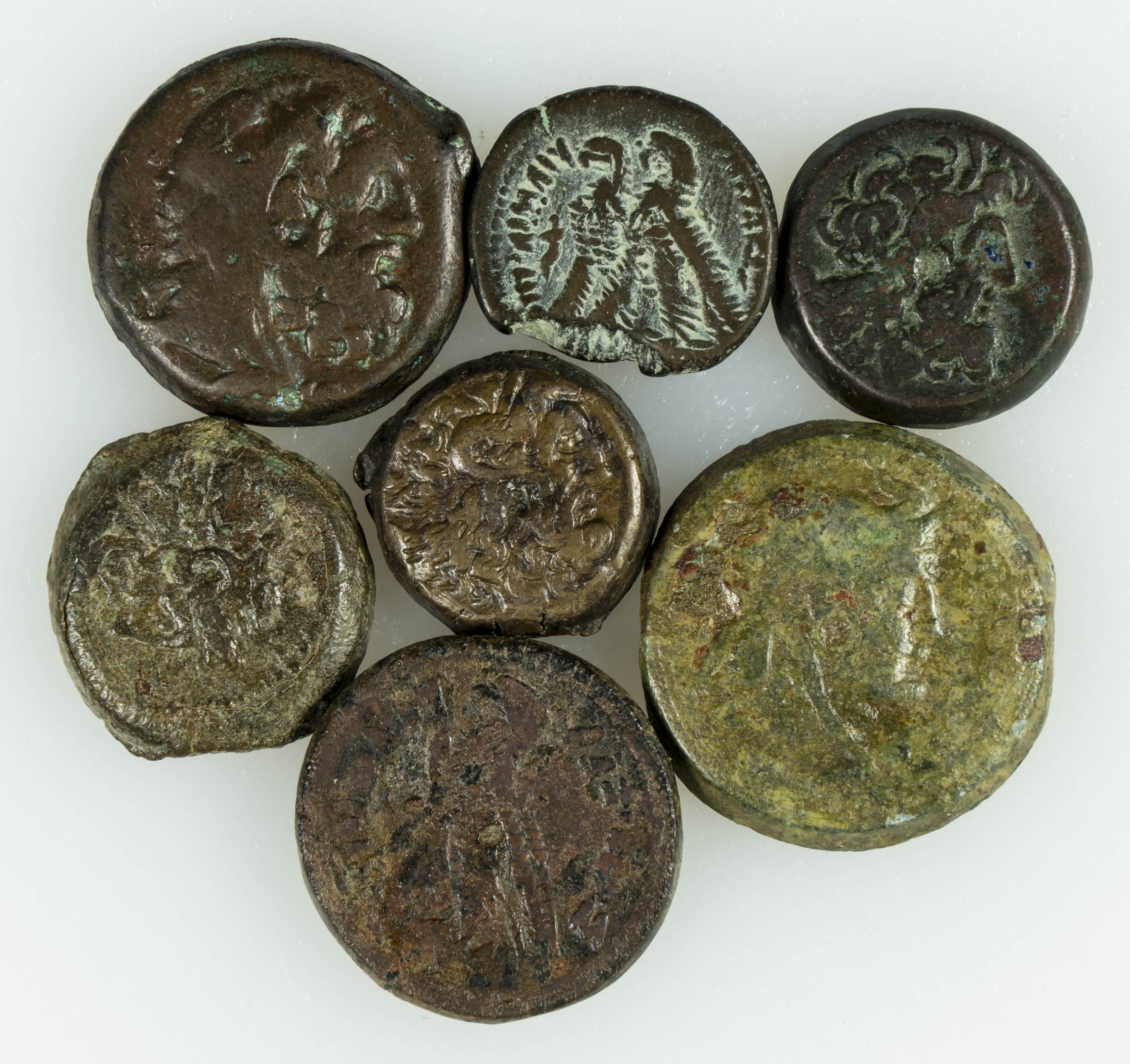 MONEDAS GRIEGAS. Interesante conjunto formado por 7 acuñaciones del reino Ptolemaíco, a nombre de Ptolomeo V, Ptolomeo VI y Ptolomeo VIII. Diferentes pesos y estados de conservación. A EXAMINAR.