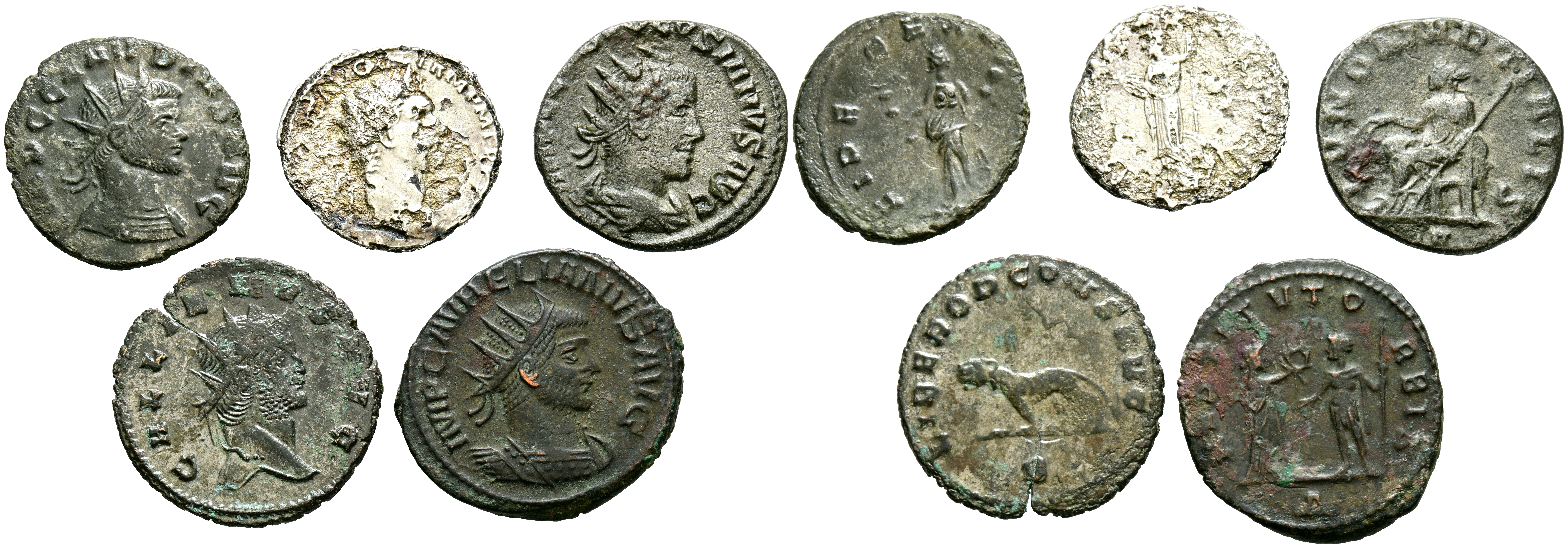 IMPERIO ROMANO. Interesante conjunto de 5 piezas bajo imperiales de diferentes emperadores: 4 antoninianos y 1 denario de Domiciano. Diferentes estados de conservación. A EXAMINAR.