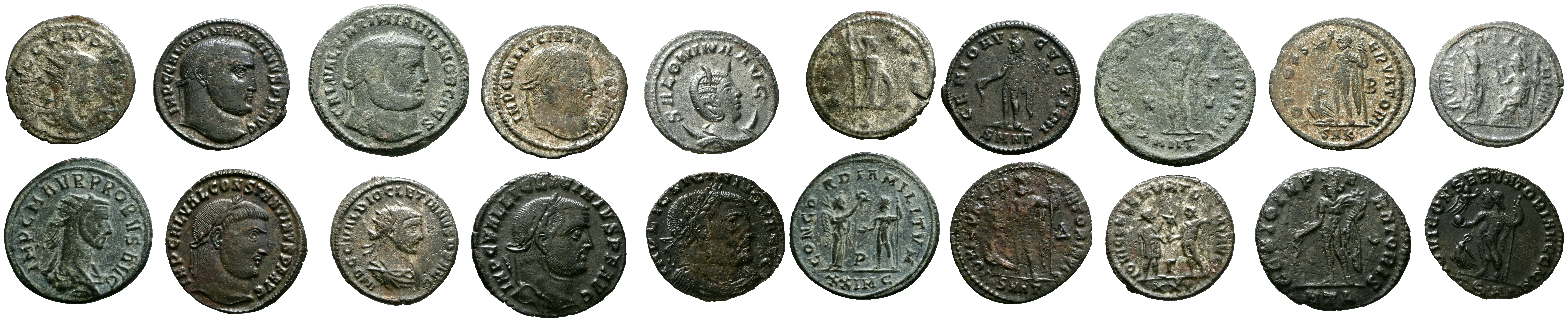 IMPERIO ROMANO. Interesante y atractivo conjunto de 10 monedas del bajo impero romano de distintos emperadores, módulos y reversos, algunos de ellos conservan parte de su plateado original. A EXAMINAR.