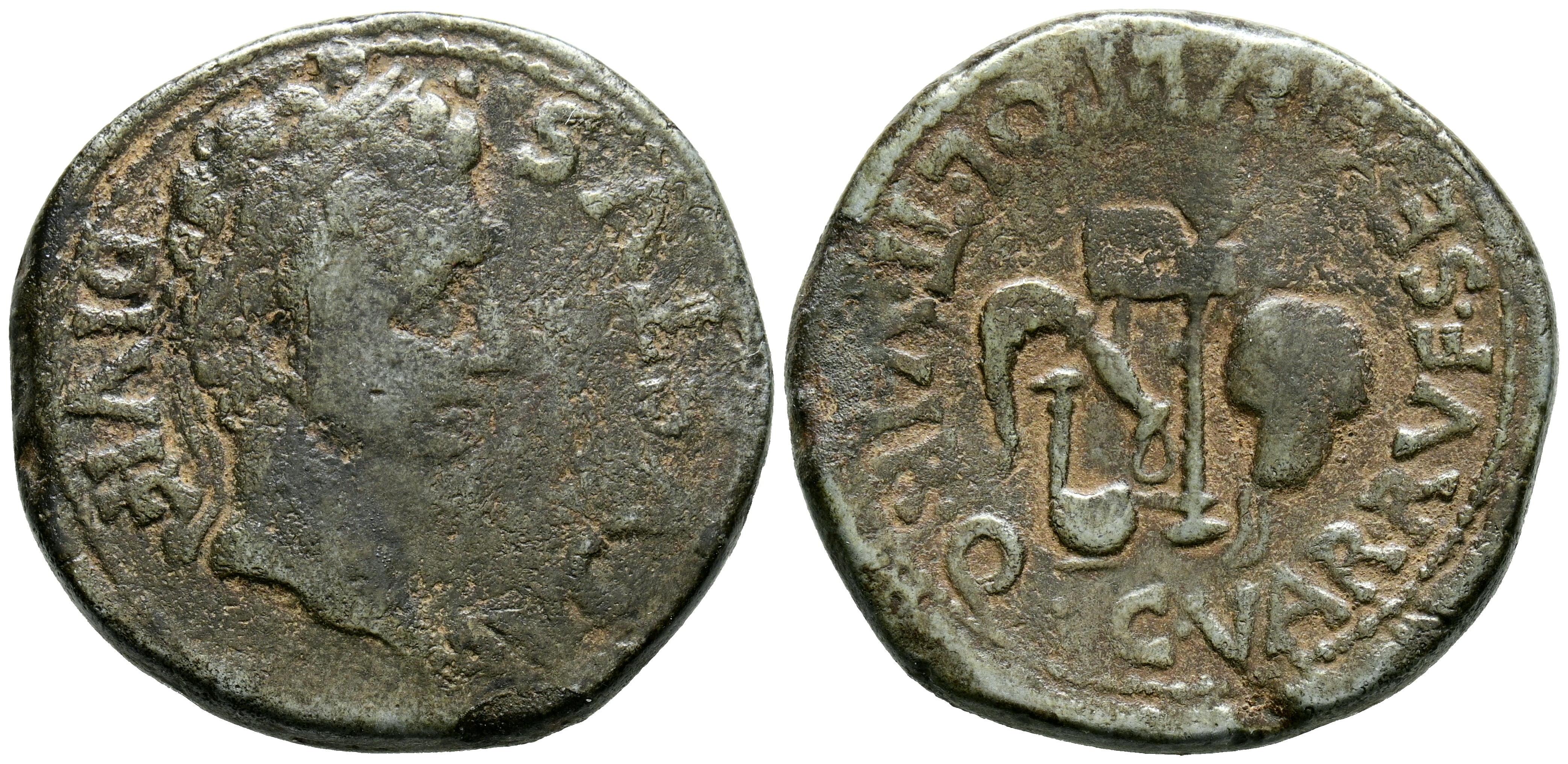 CARTAGONOVA (Cartagena, Murcia). As. (Ae. 10,10g/29mm). 27 a.C.-14 d.C. (FAB-577). Anv: Cabeza de Augusto laureado a derecha, alrededor leyenda: AVGVSTVS DIVI F. Rev: Aspérgilo, símpulo, segur y apex, alrededor leyenda: C VAR RVF SEX IVL POL II VOR Q. MBC-/MBC.