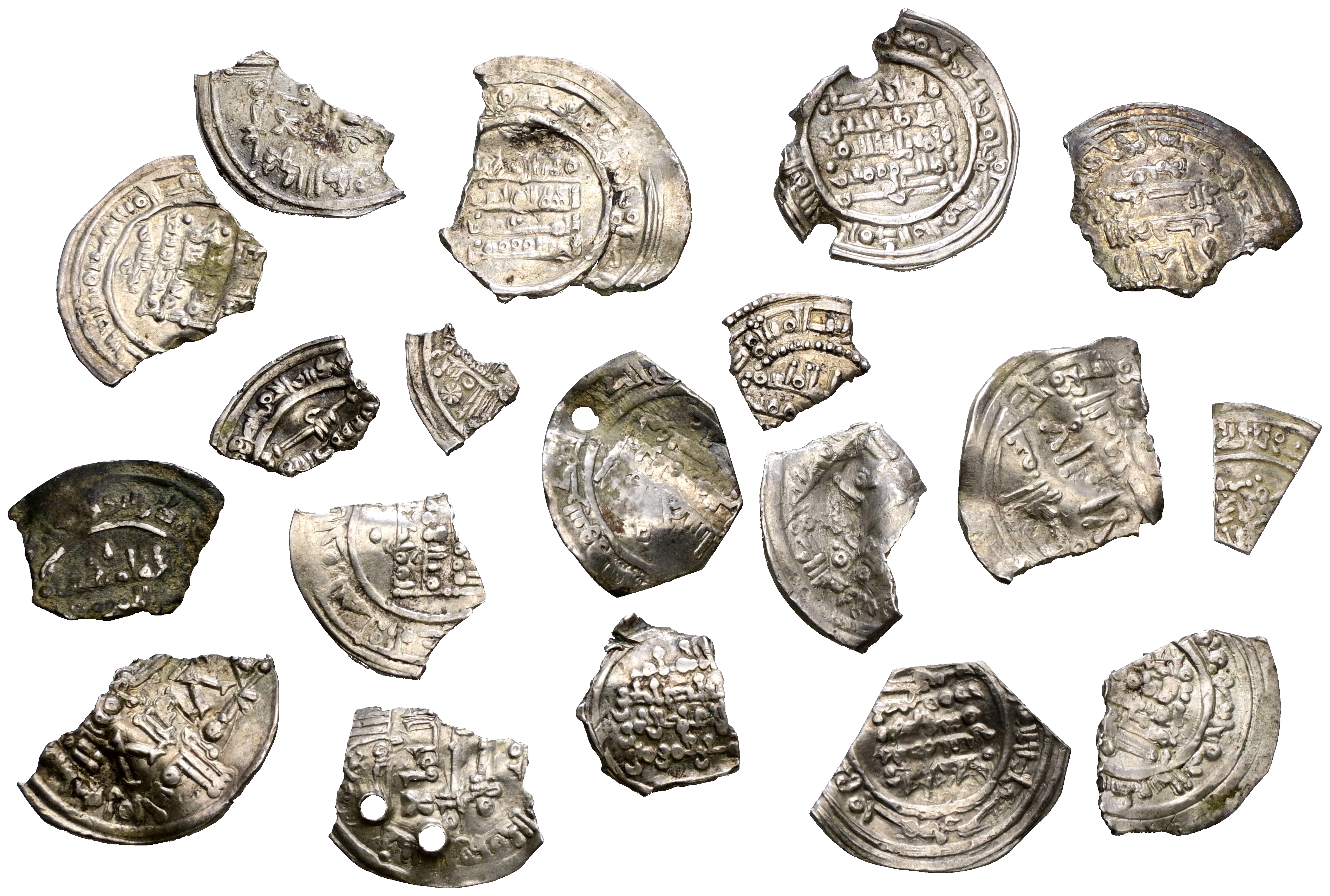 HISPANO ARABE. Interesante conjunto formado por 19 fracciones de dirham, de los cuales una gran parte coresponden a acuñaciones hammudíes. Diferentes años, cecas, medidas y estados de conservación. A EXAMINAR.