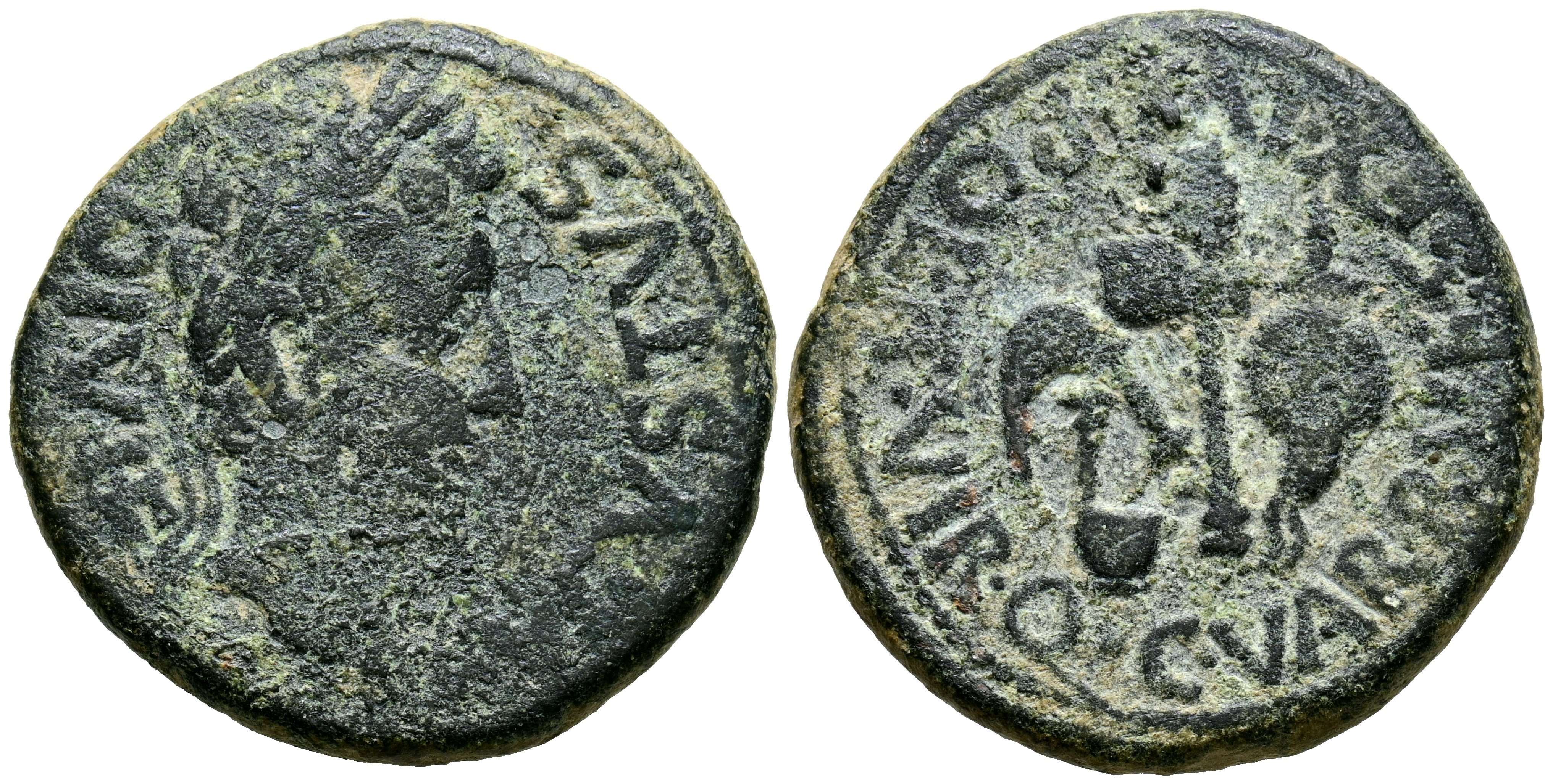 CARTAGONOVA (Cartagena, Murcia). As. (Ae. 13,11g/28mm). 27 a.C.-14 d.C. (FAB-577). Anv: Cabeza de Augusto laureado a derecha, alrededor leyenda: AVGVSTVS DIVI F. Rev: Aspérgilo, símpulo, segur y apex, alrededor leyenda: C VAR RVF SEX IVL POL II VOR Q. MBC-.