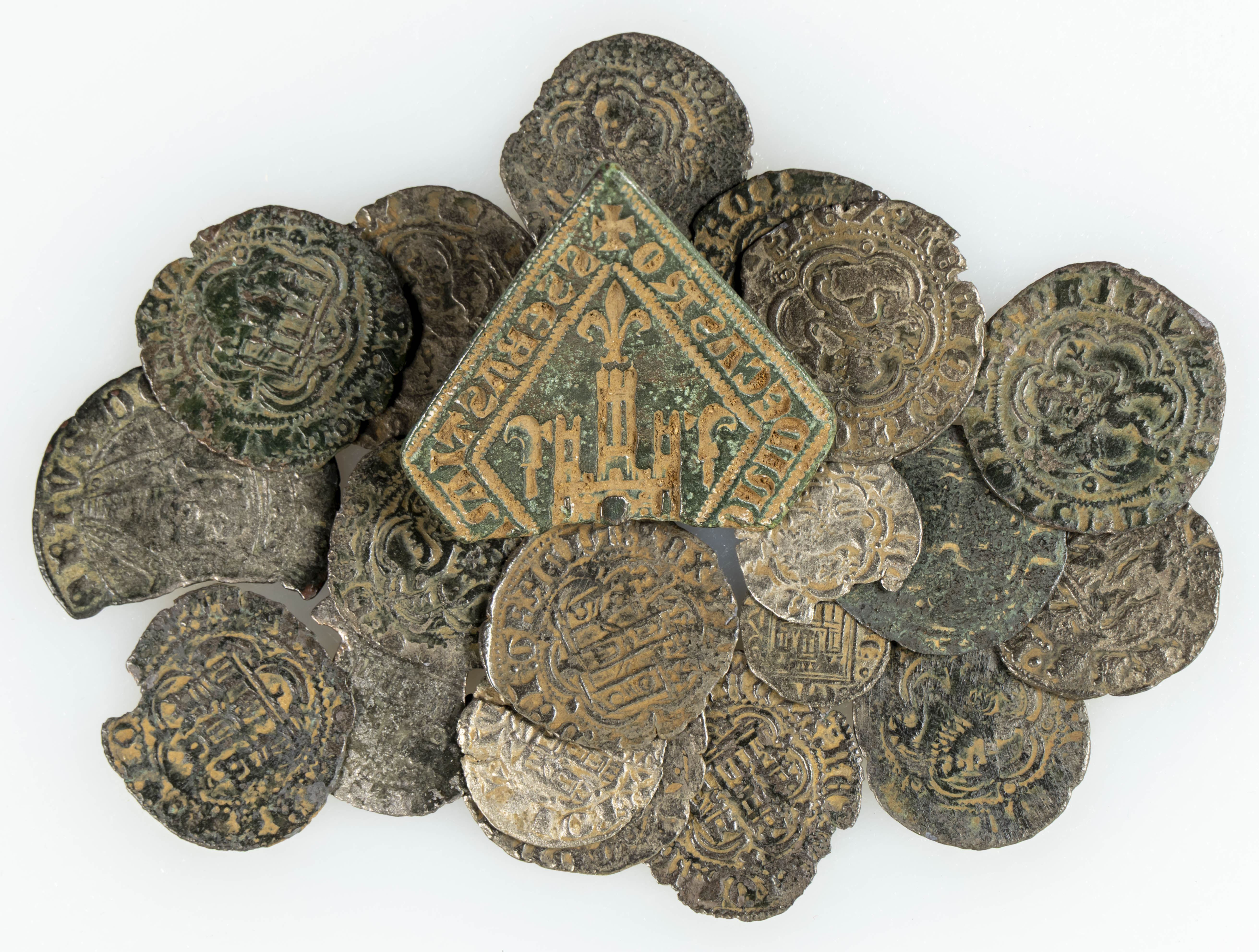 ÉPOCA MEDIEVAL. Precioso e interesante conjunto formado por 21 monedas de diferentes módulos, especialmente blancas, y con una gran variedad de reinados representados (Alfonso X, Enrique III, Juan II o Enrique IV) y cecas, destacando entre ellas un cuartillo de Jaén. El conjunto se remata con un espectacular sello medieval, de la época de Alfonso X, partido a identificar. Diferentes estados de conservación. A EXAMINAR.